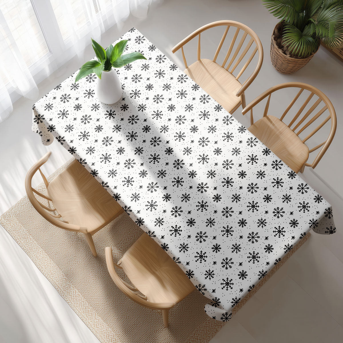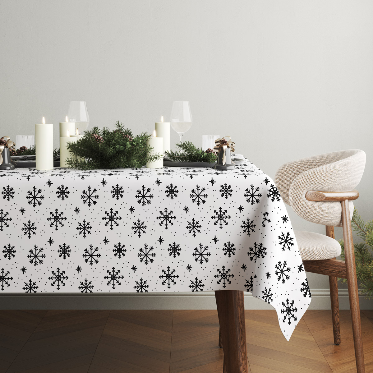 Biały obrus z czarnym wzorem płatków śniegu. Dostępny w gotowych rozmiarach i na wymiar – idealny do nowoczesnych aranżacji zimowych. Subtelny i elegancki dodatek do jadalni i salonu.