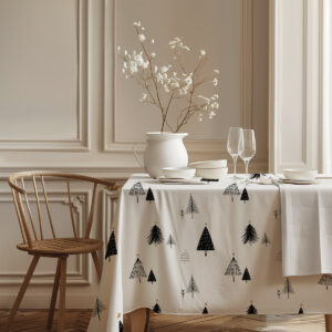 Biały obrus świąteczny z czarnym wzorem choinek. Dostępny w gotowych rozmiarach i na wymiar – elegancki, minimalistyczny i idealny do zimowych dekoracji stołu.