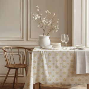 Biały obrus świąteczny z delikatnym złotym wzorem gwiazd. Subtelny, elegancki i ponadczasowy – idealny na świąteczny stół, zimowe kolacje i spotkania w rodzinnym gronie.