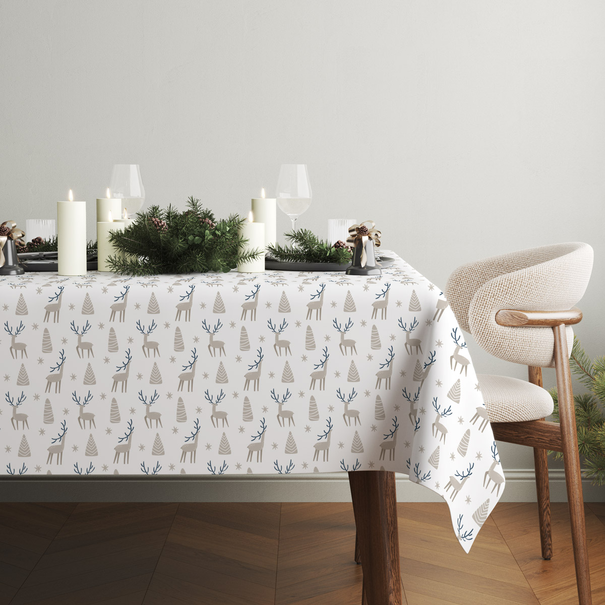 Jasny obrus świąteczny z uroczym wzorem beżowych reniferów i choinek. Subtelny, przytulny i elegancki – wprowadzi do wnętrza ciepłą, zimową atmosferę w skandynawskim stylu.