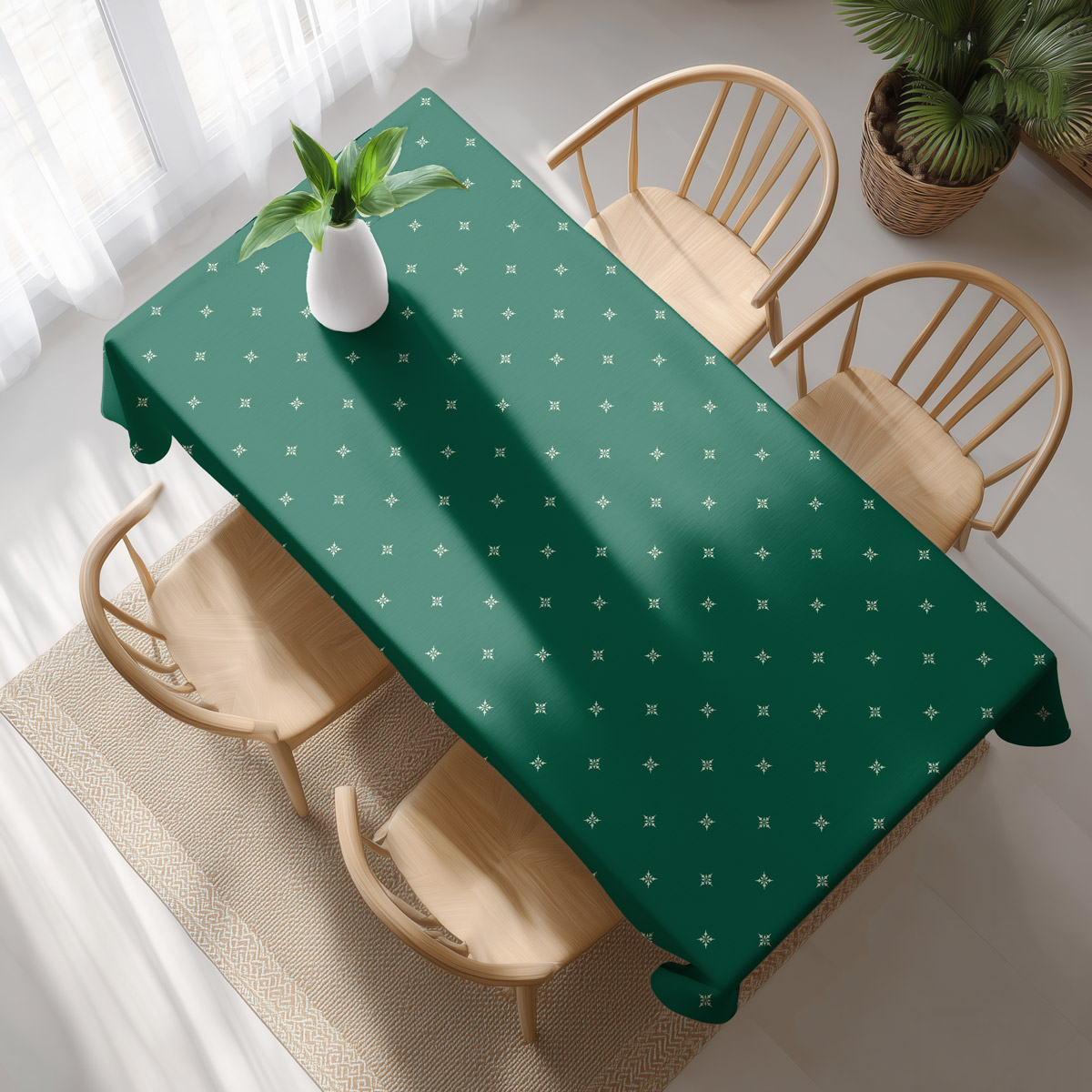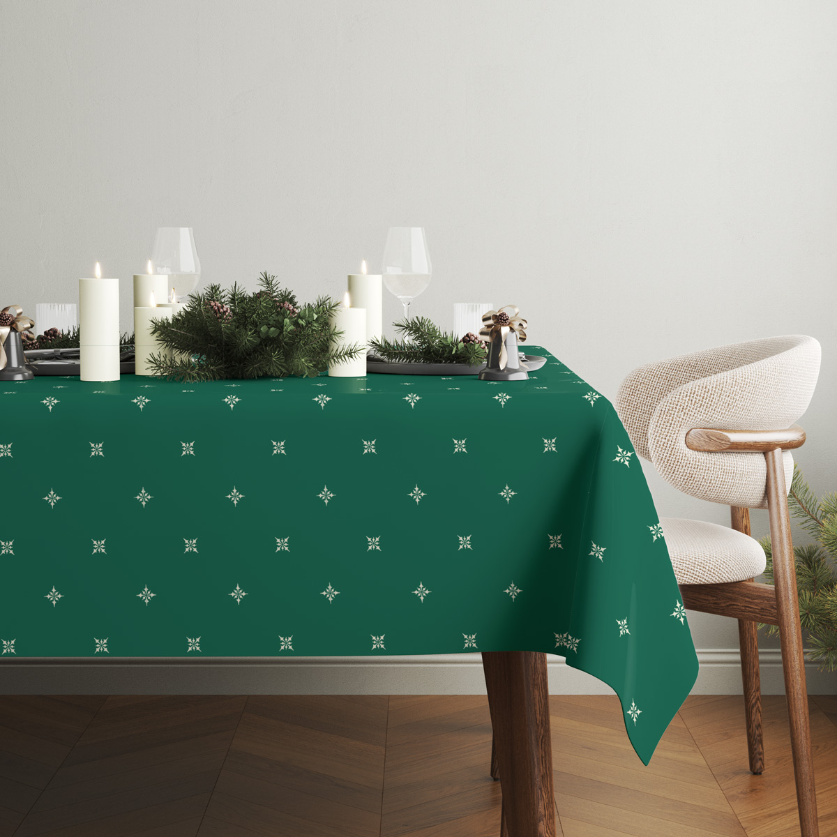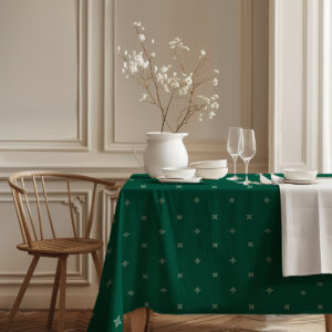 Zielony obrus świąteczny z subtelnym, symetrycznym wzorem w odcieniu jasnego beżu. Elegancki i ponadczasowy – doskonały do klasycznych aranżacji stołu podczas Świąt i zimowych spotkań.