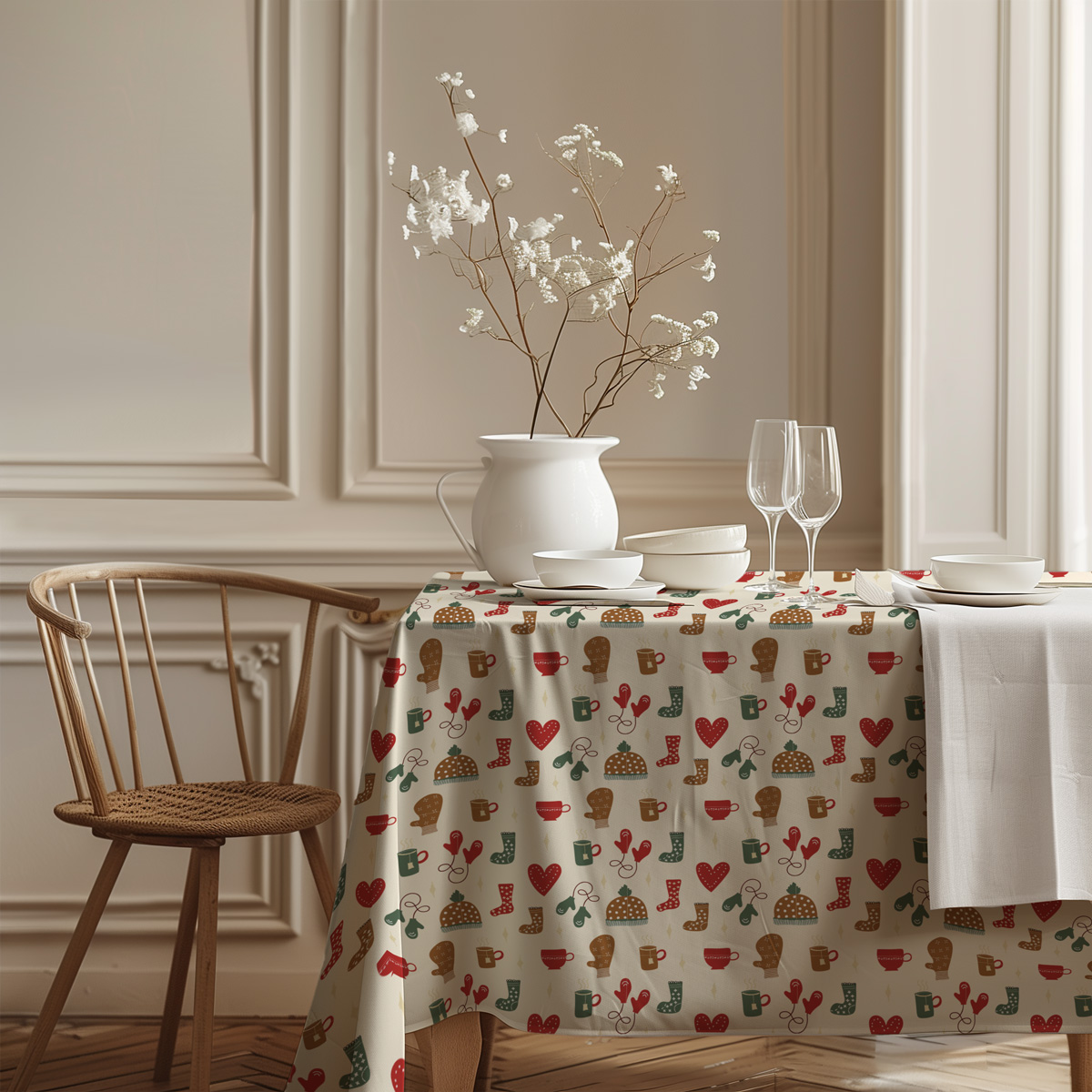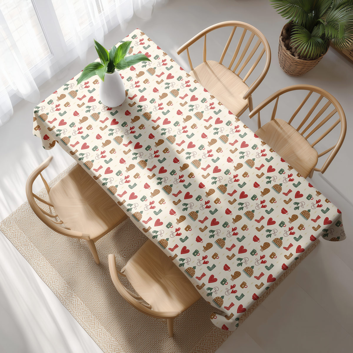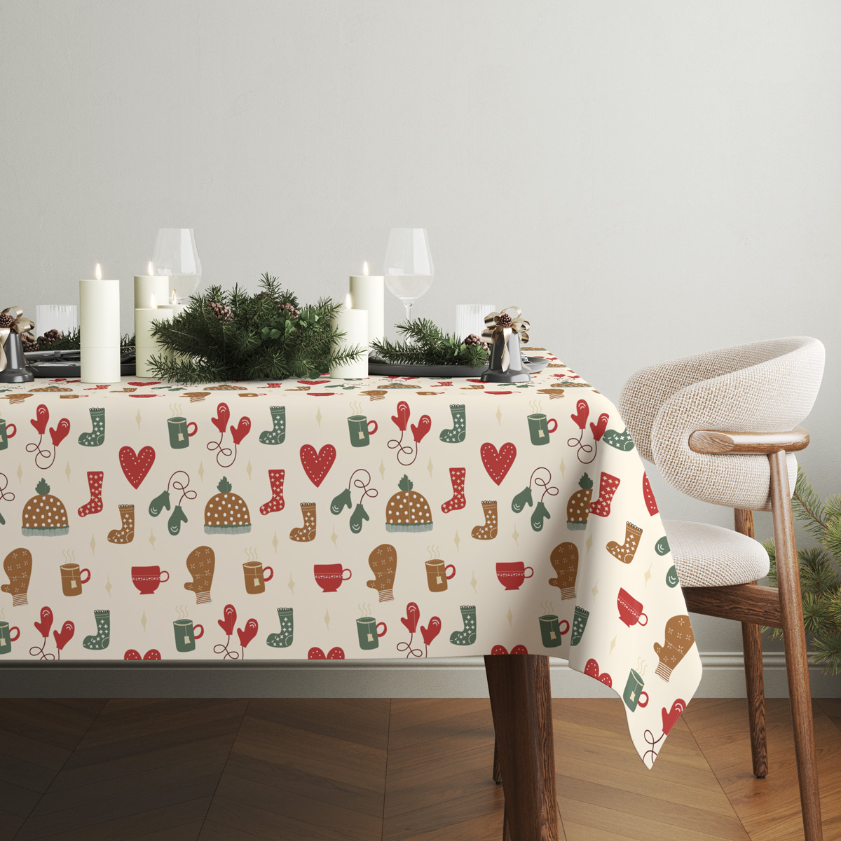 Plamoodporny obrus świąteczny na kremowym tle ze skandynawskimi motywami: rękawiczki, serca, skarpety, kubki. Trwałe kolory, estetyczne wykończenie. Rozmiary standardowe i na wymiar – idealny na Wigilię i zimowe spotkania.