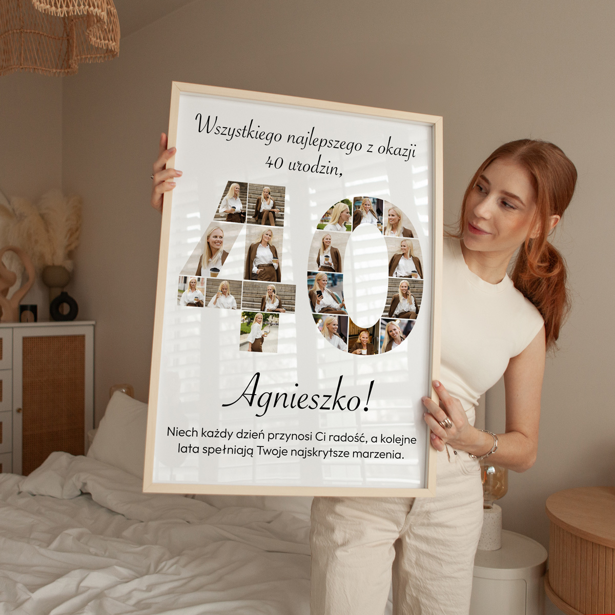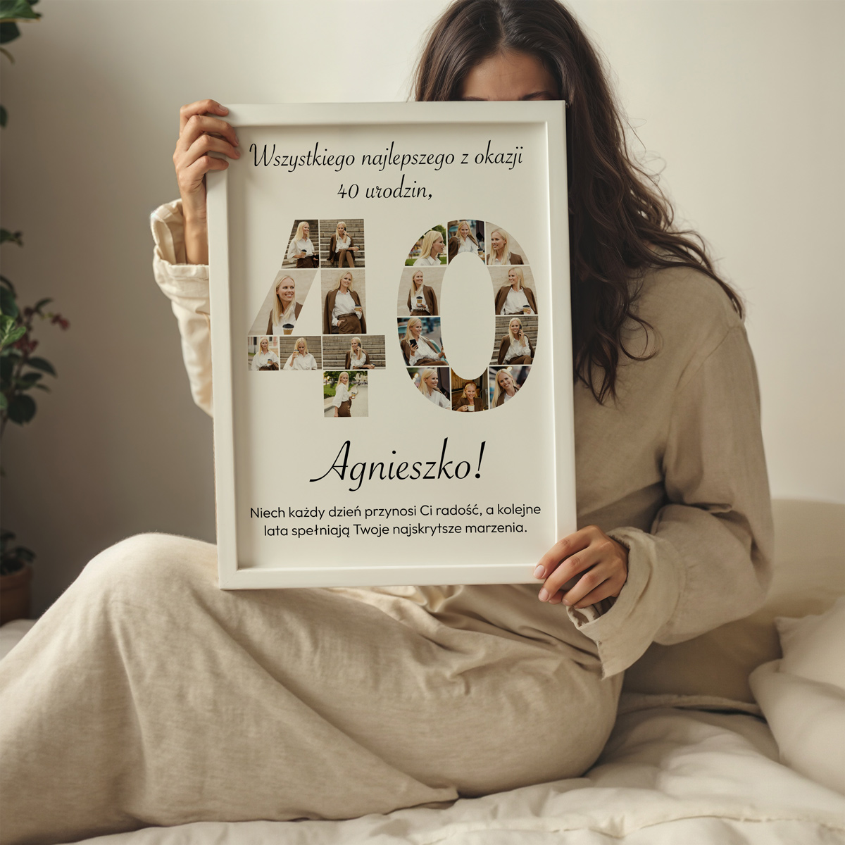 Wyjątkowy plakat personalizowany na 40 urodziny, który zamienia wspomnienia w piękny kolaż ze zdjęć. To elegancki i wzruszający prezent dla bliskiej osoby – doskonały zarówno dla kobiety, jak i mężczyzny.