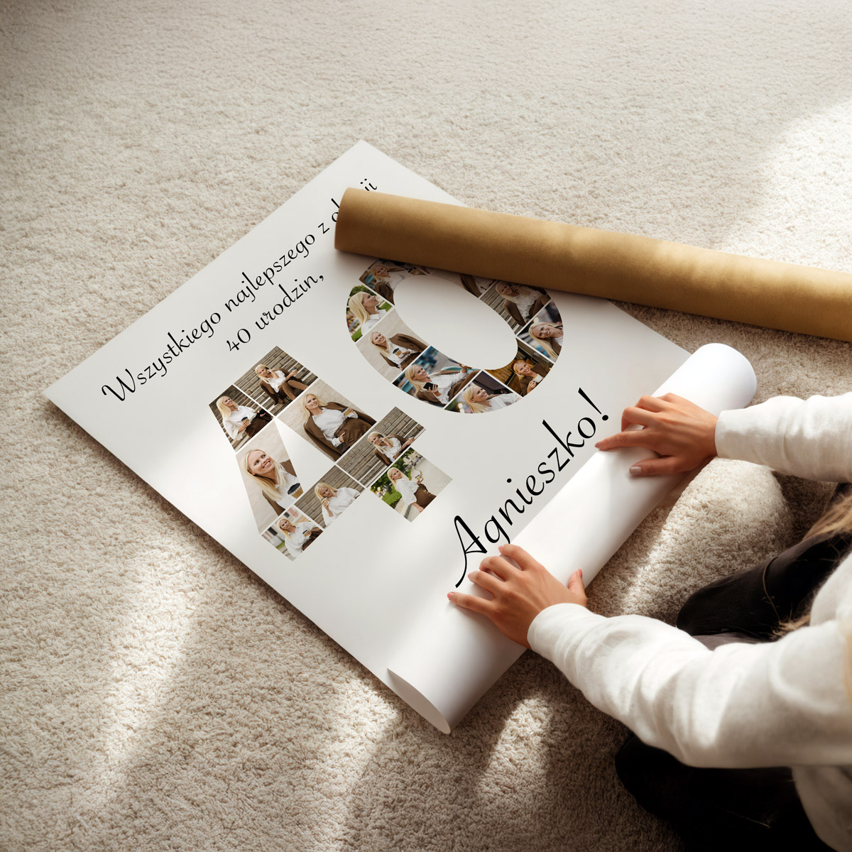 Podaruj wyjątkowy plakat personalizowany na 40 urodziny, który pozwala zachować najpiękniejsze chwile w formie eleganckiego kolażu. Liczba 40 wypełniona zdjęciami to nie tylko oryginalna dekoracja, ale też symbol wspólnych wspomnień, emocji i radości.
