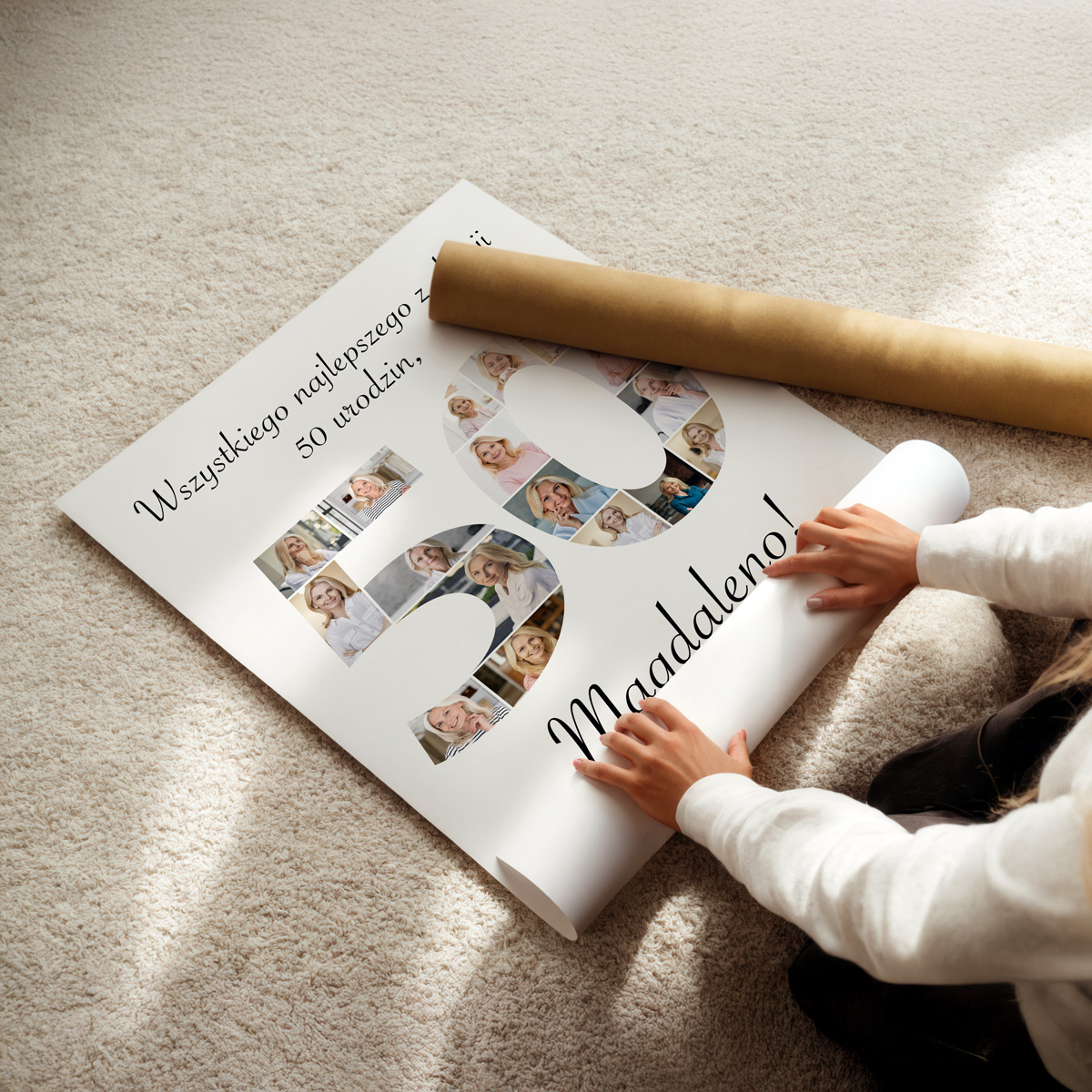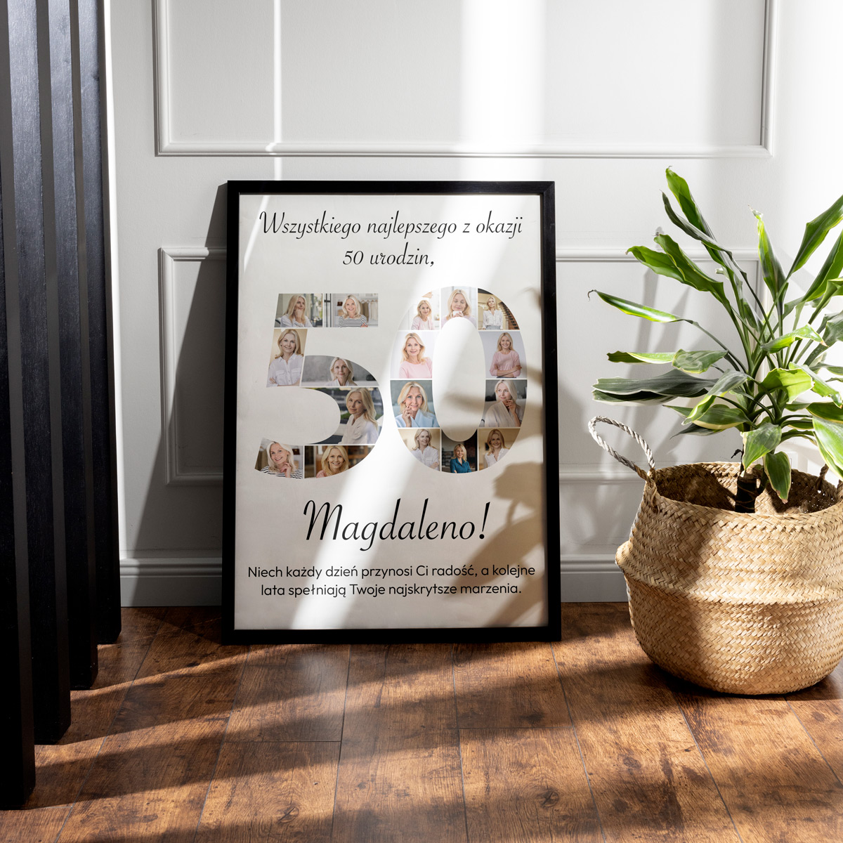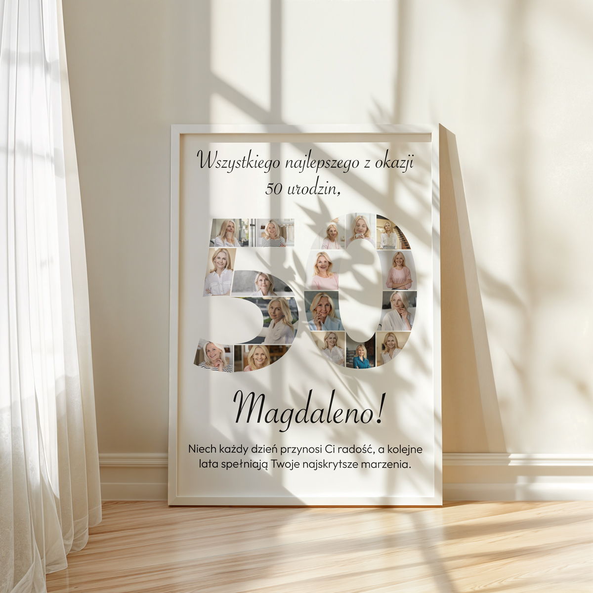 Wyjątkowy plakat personalizowany na 50 urodziny w formie kolażu ze zdjęć. Dodaj własne fotografie i życzenia, zobacz podgląd na żywo i stwórz oryginalny prezent dla bliskiej osoby.