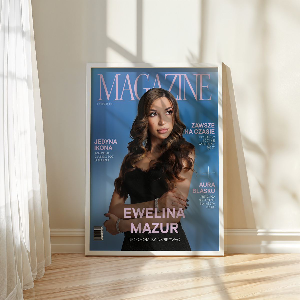 Wyjątkowy plakat personalizowany, który zamienia Twoje zdjęcie w elegancką okładkę w stylu Pink Magazine. Styl glamour, modne hasła i nowoczesny design sprawiają, że to dekoracja pełna klasy i charakteru. Przyciąga wzrok i świetnie wygląda w ramie.