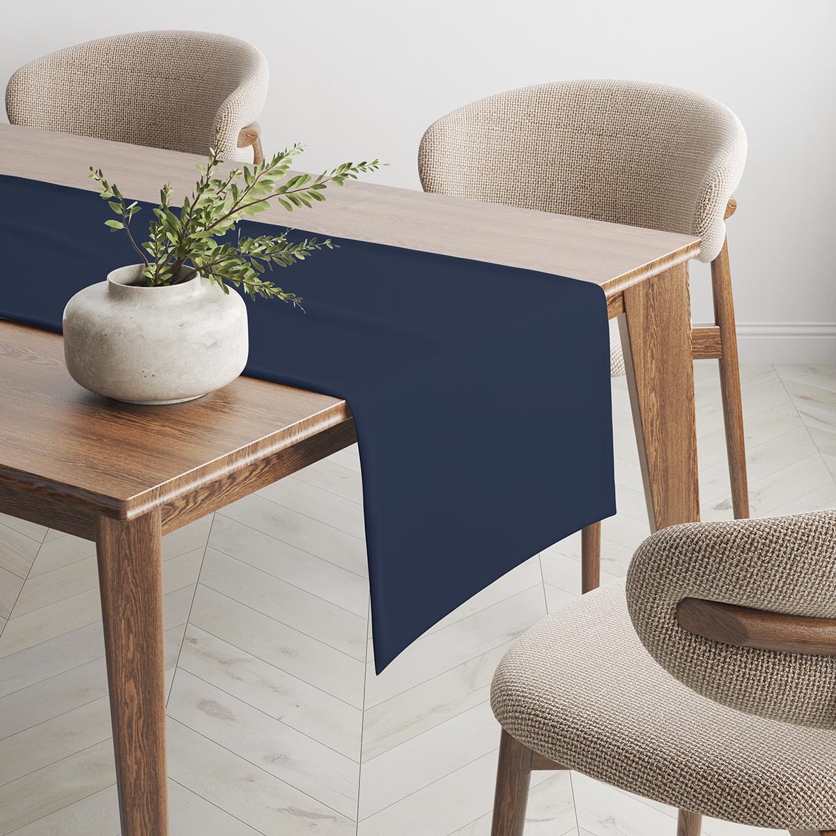 Ten gładki bieżnik wyróżnia się głębokim, intensywnym odcieniem granatu i subtelną, matową fakturą tkaniny. Prosty, jednolity wzór podkreśla naturalne piękno stołu bez zbędnych ozdobników.