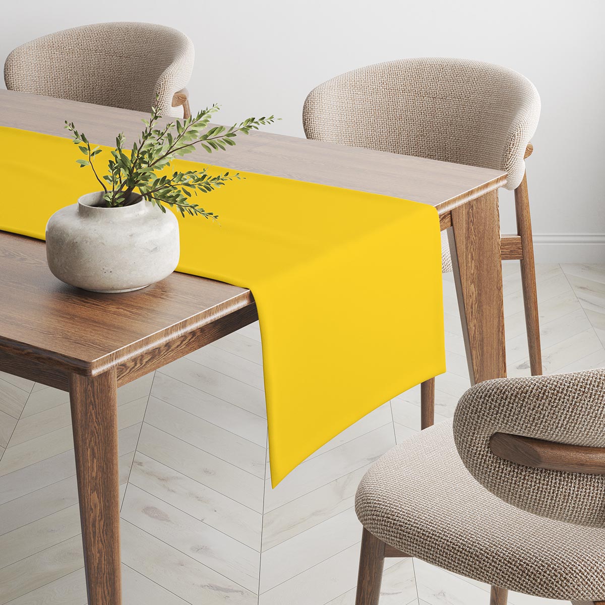 Żółty bieżnik wielkanocny wprowadza wiosenny, świąteczny nastrój na stół. Gładka, jednokolorowa tkanina z nadrukiem sublimacyjnym najwyższej jakości podkreśla prostotę i elegancję aranżacji.