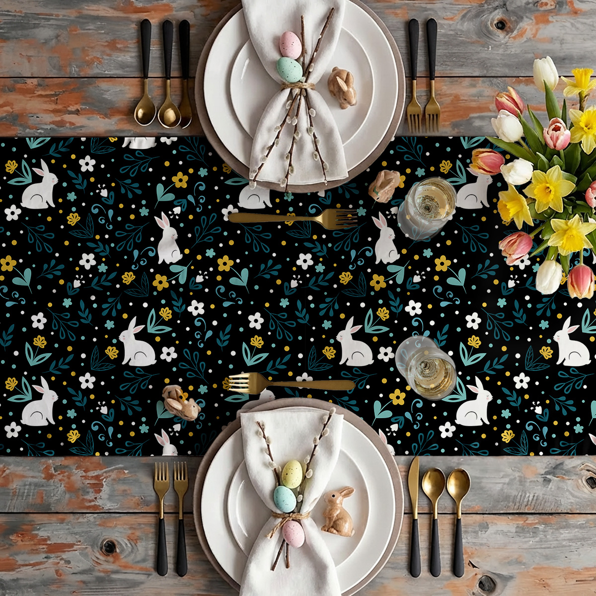 Bieżnik na stół – czarne tło z zajączkami i kwiatami
