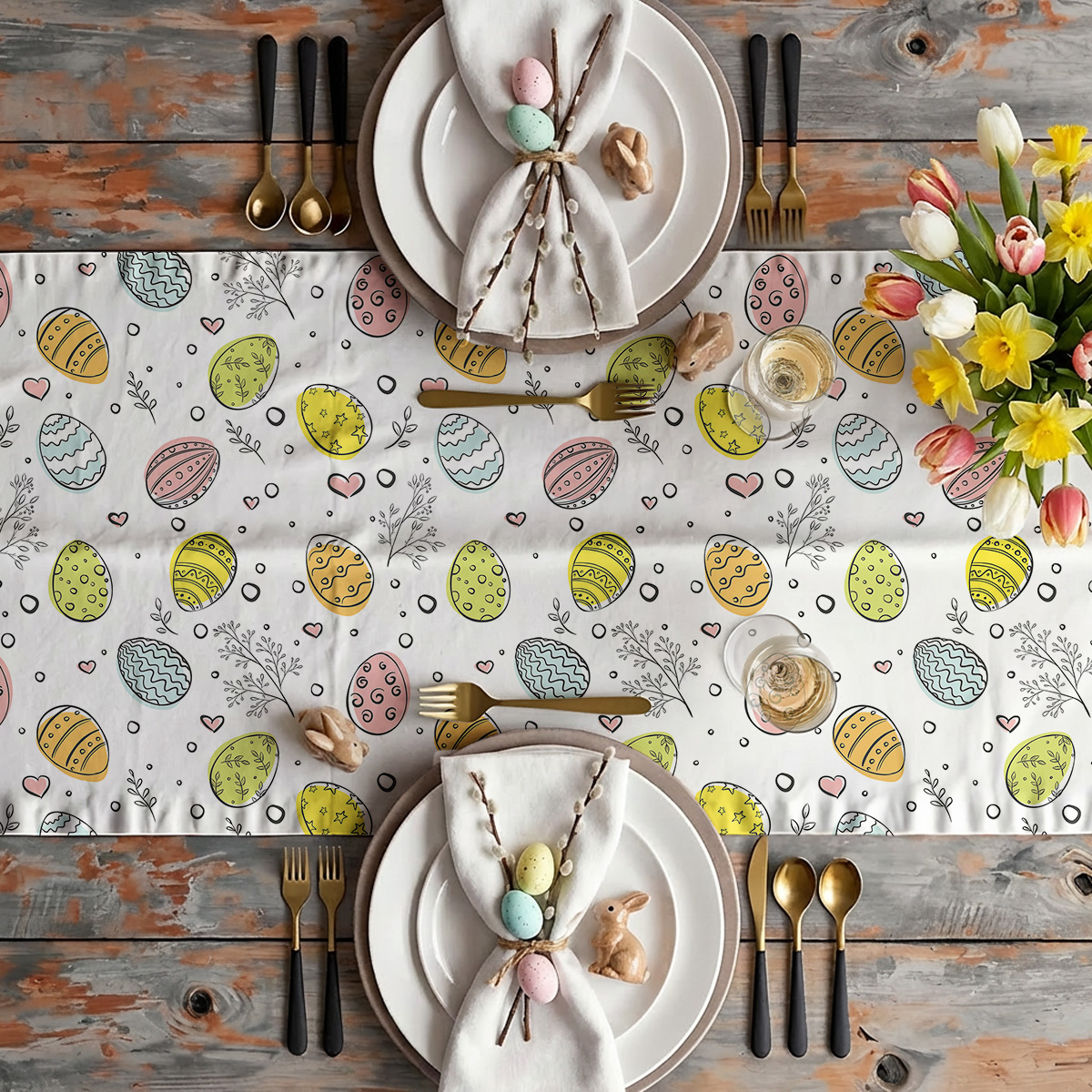 Na przedstawionych ujęciach bieżnik pokazany jest w różnych stylizacjach, od rustykalnej po bardziej elegancką, co świadczy o jego uniwersalności. To propozycja, która od razu wnosi wiosenny nastrój i ułatwia stworzenie spójnej, świątecznej dekoracji stołu.