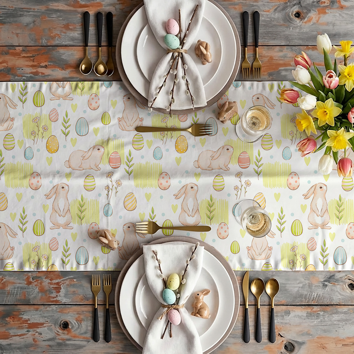 Świetnie wygląda w aranżacjach z wiosennymi dekoracjami: bukietem tulipanów, gałązkami kotków i pastelowymi dodatkami. Można go użyć zarówno na rustykalnym drewnianym stole, jak i na bardziej nowoczesnej powierzchni, by dodać świątecznego ciepła.