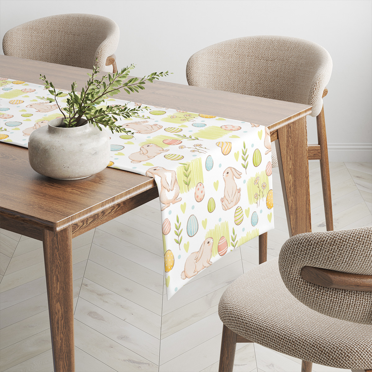 Uroczy świąteczny bieżnik z motywem króliczków i pisanek w delikatnych pastelowych odcieniach. Nadaje stołowi wiosennego charakteru i sprawdzi się przy rodzinnym śniadaniu wielkanocnym.