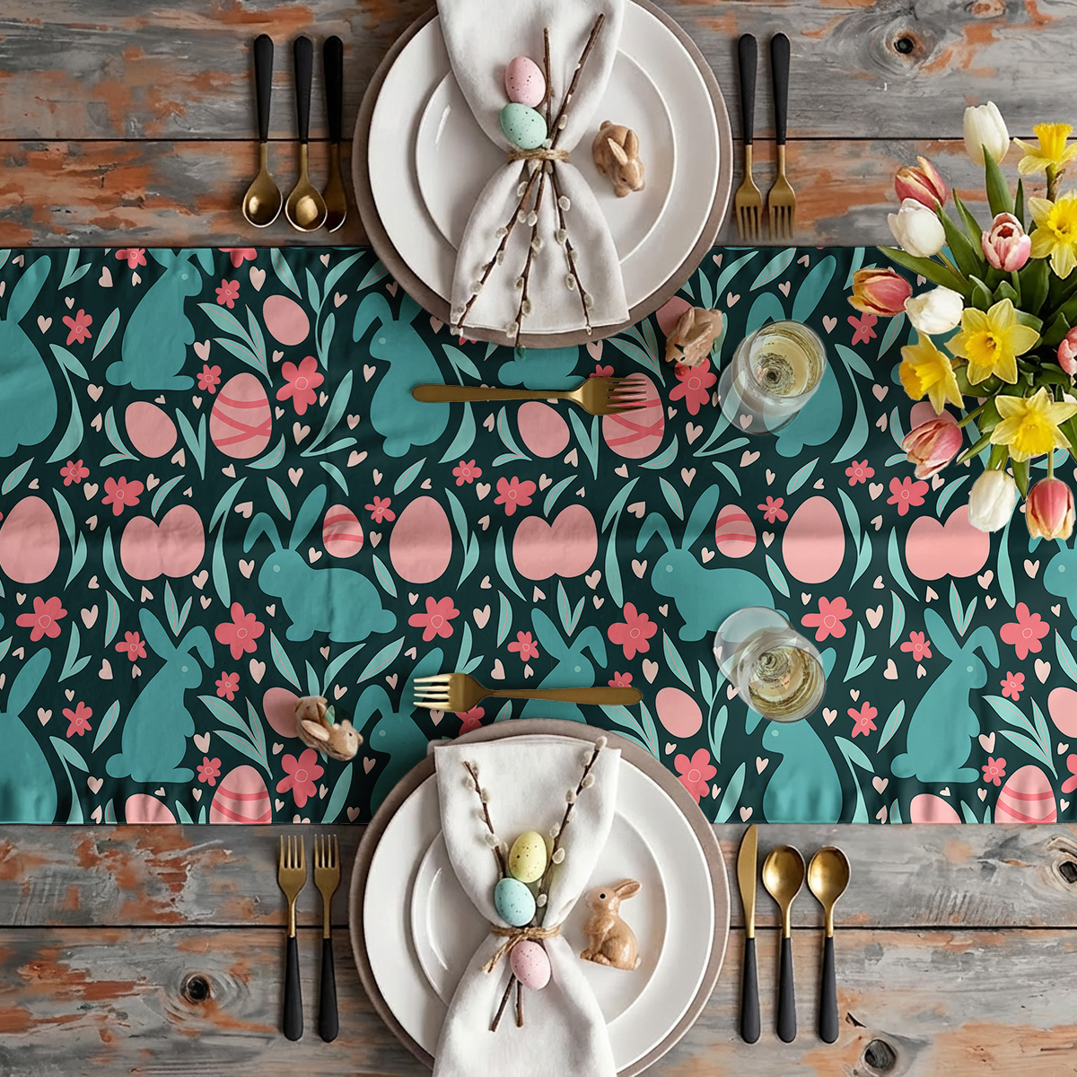 Kolorowy bieżnik z motywem zajączków i pisanek doda świątecznego charakteru stołowi. Pastelowe odcienie i drobne kwiatowe detale tworzą radosną aranżację na wielkanocne spotkania.