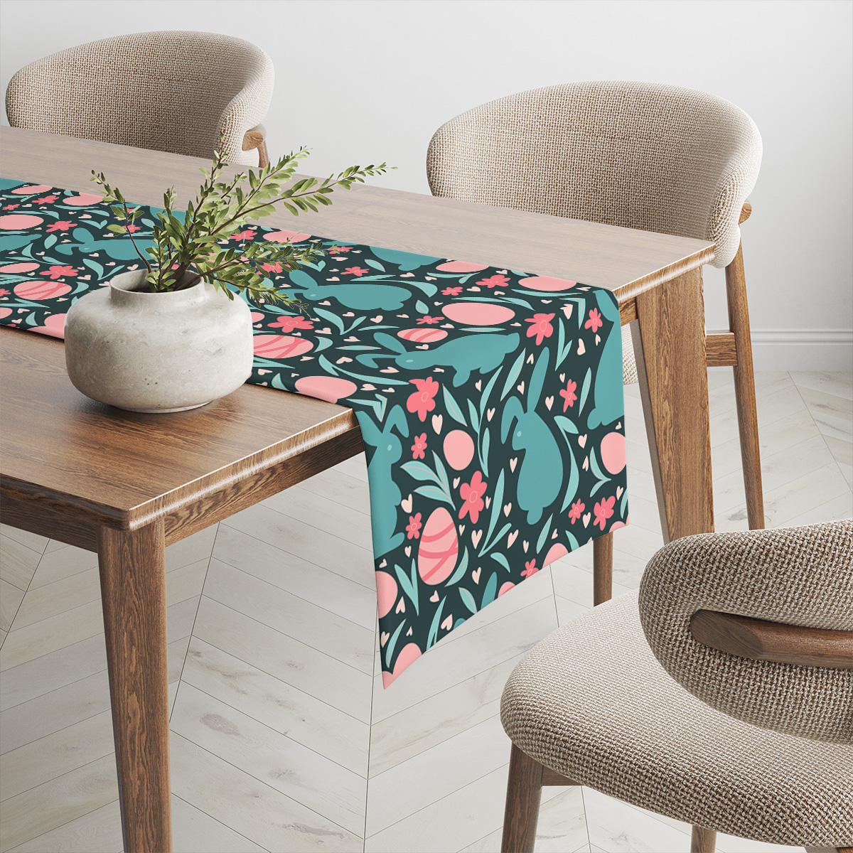Bieżnik świetnie sprawdzi się jako główny akcent podczas wielkanocnych posiłków, subtelnie podkreślając zastawę i dekoracje stołu. Wzór rozmieszczony jest równomiernie na całej powierzchni, dzięki czemu aranżacja zachowuje spójność niezależnie od ustawienia naczyń.