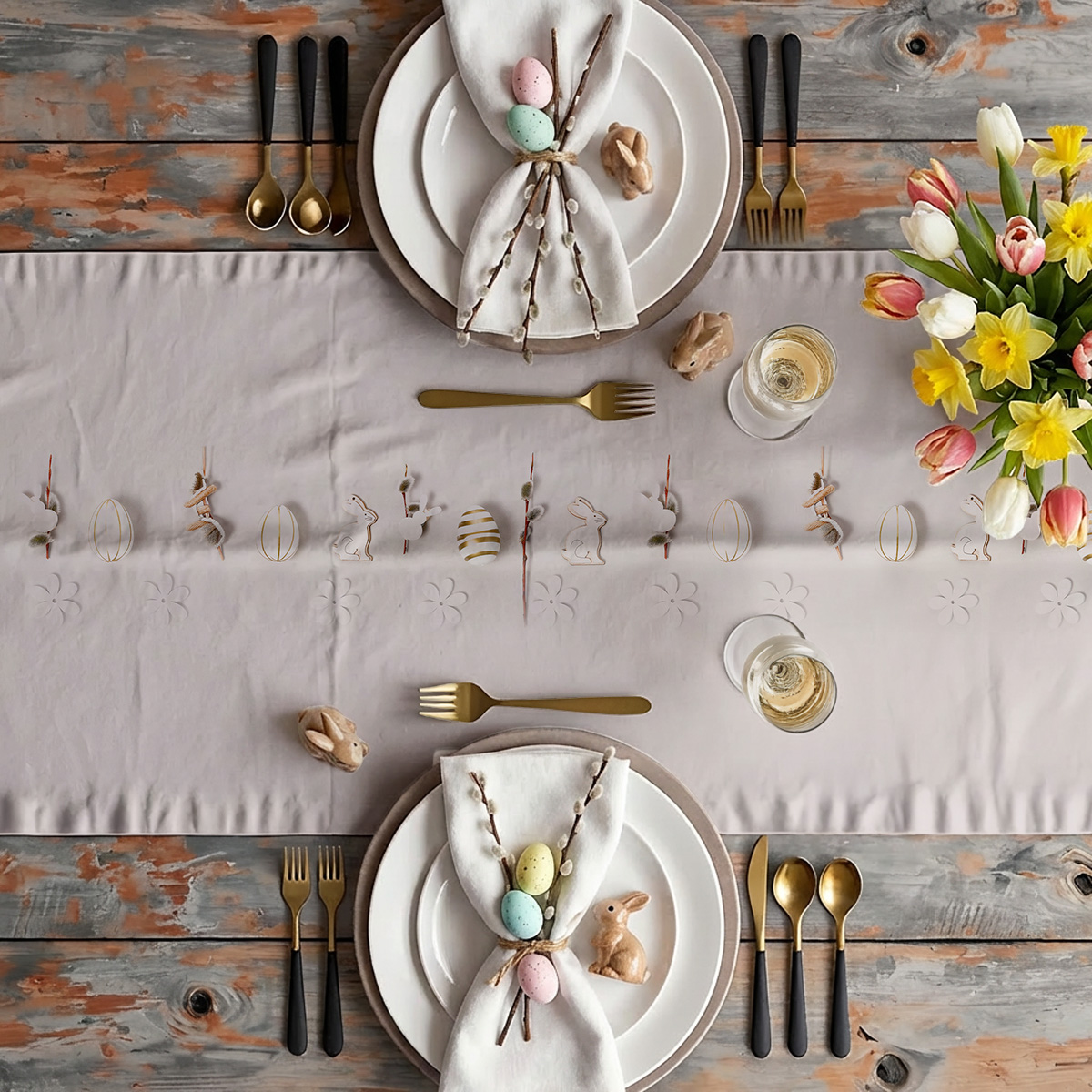 Świąteczny bieżnik to propozycja dla osób ceniących stonowaną elegancję i subtelne dekoracje. Na gładkim tle ułożony jest pionowy pas z motywami zajączków, pisanek i delikatnych kwiatów, który wprowadza wiosenny charakter świątecznej aranżacji stołu.