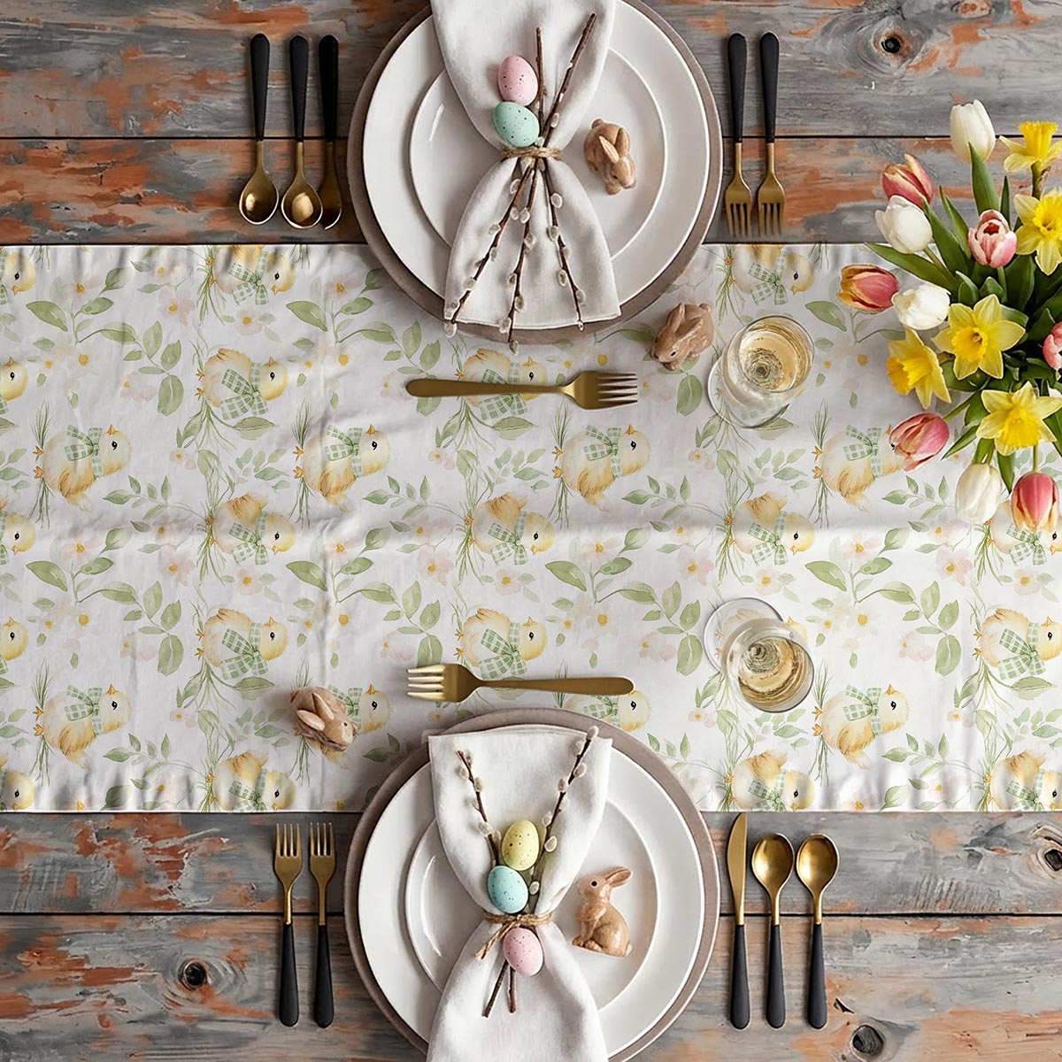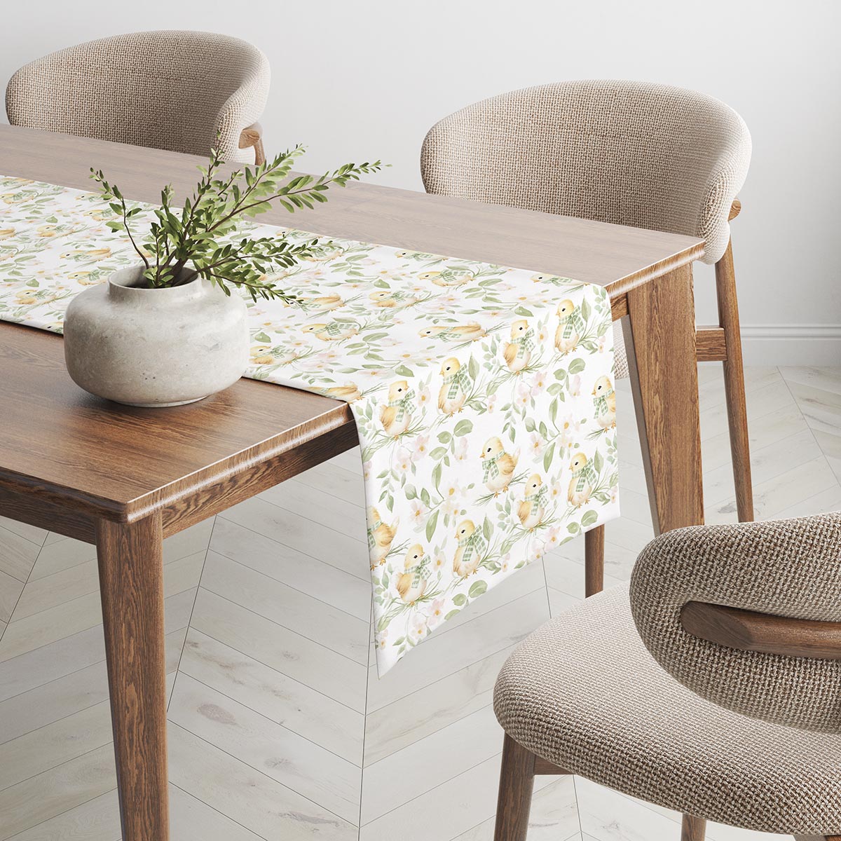 Ten bieżnik łączy subtelny, pastelowy motyw z uroczymi kurczaczkami i delikatnymi listkami, tworząc elegancką, a zarazem radosną dekorację stołu na świąteczne spotkania. Wzór został zaprojektowany z myślą o atmosferze wielkanocnej — idealny do podkreślenia świątecznych dodatków i wiosennych aranżacji. Tkanina charakteryzuje się wyraźnym nadrukiem i przyjemną fakturą, dzięki czemu bieżnik wygląda naturalnie, a jednocześnie jest praktyczny w codziennym użyciu.