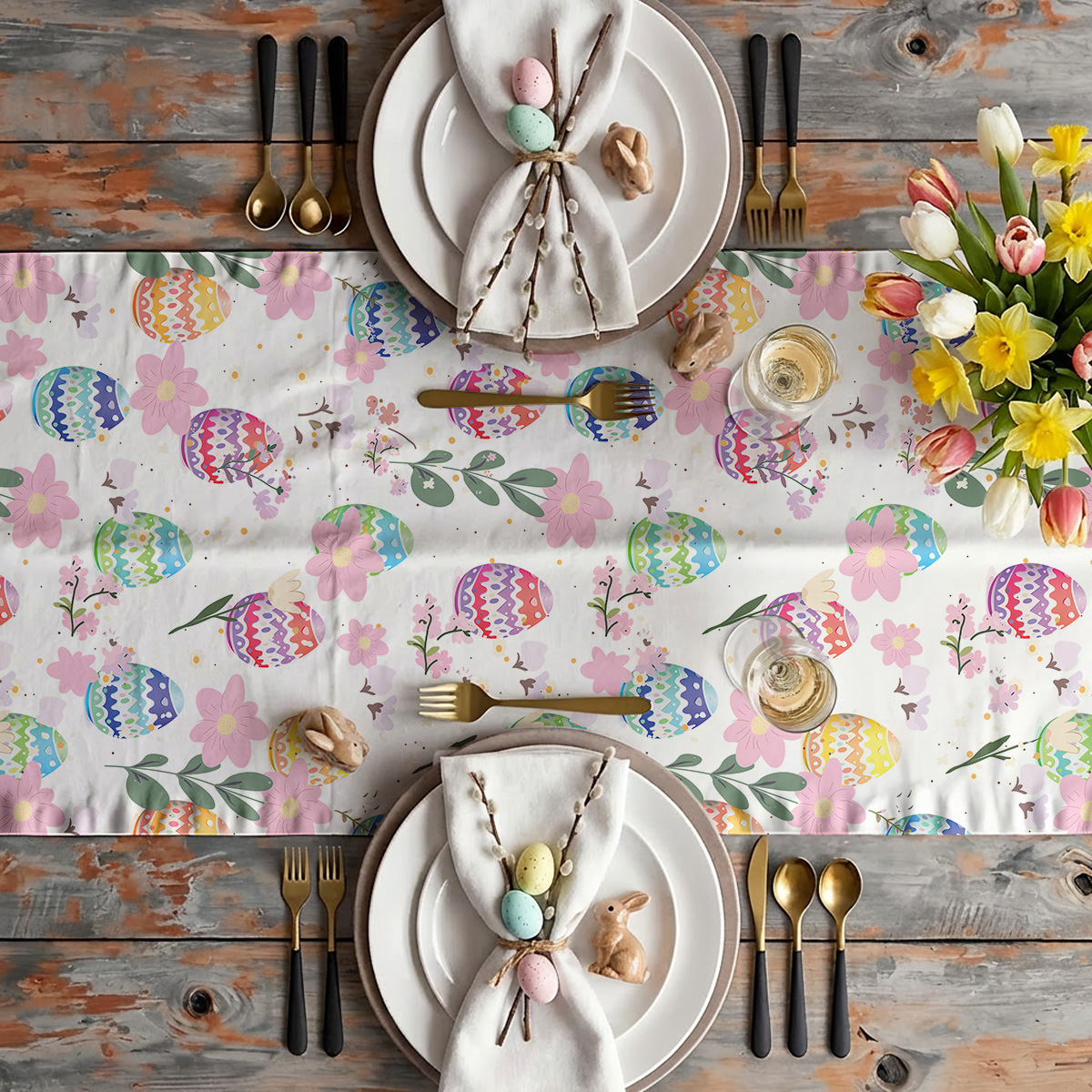 Ten bieżnik prezentuje wesoły motyw pisanek w pastelowych odcieniach, przeplatający się z delikatnymi różowymi kwiatami. Kompozycja wzoru jest lekka i pogodna, idealna do stworzenia przyjaznej, świątecznej atmosfery przy stole.