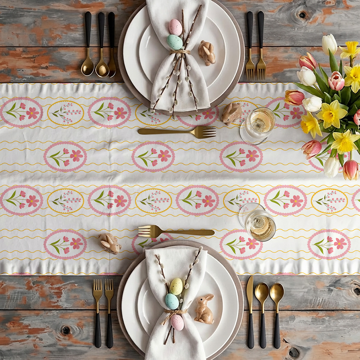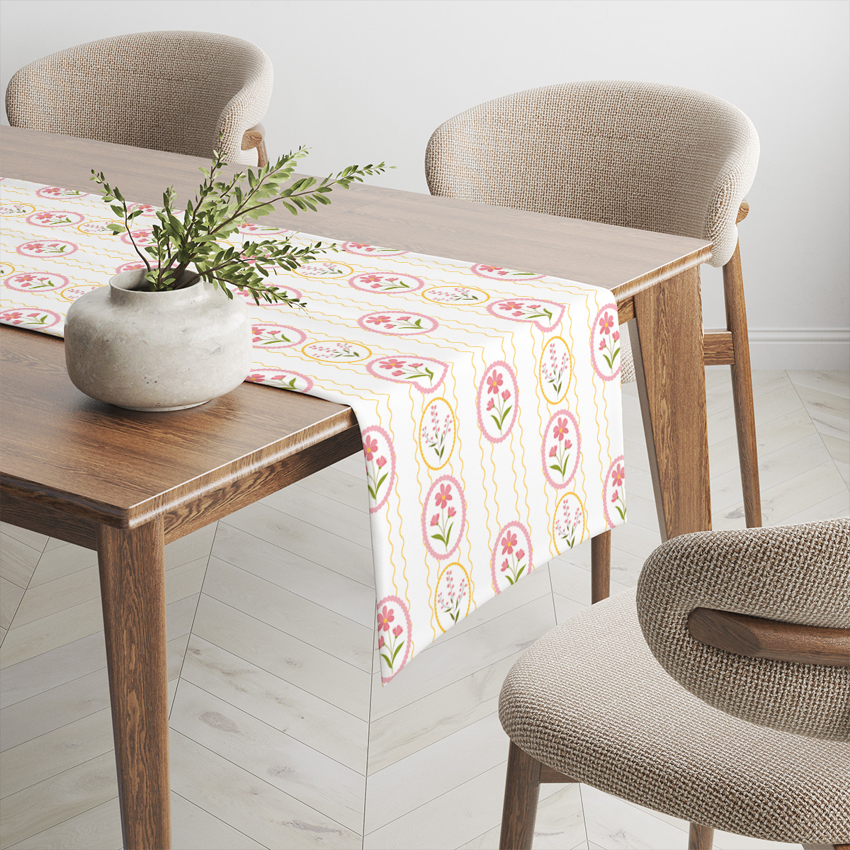 Motyw bieżnika opiera się na delikatnych owalnych ramkach z kwiatowymi kompozycjami i falistymi, złotymi liniami na jasnym tle. Dominują miękkie odcienie różu i żółci oraz świeża zieleń listków, co tworzy przyjemną, wiosenną paletę kolorów.