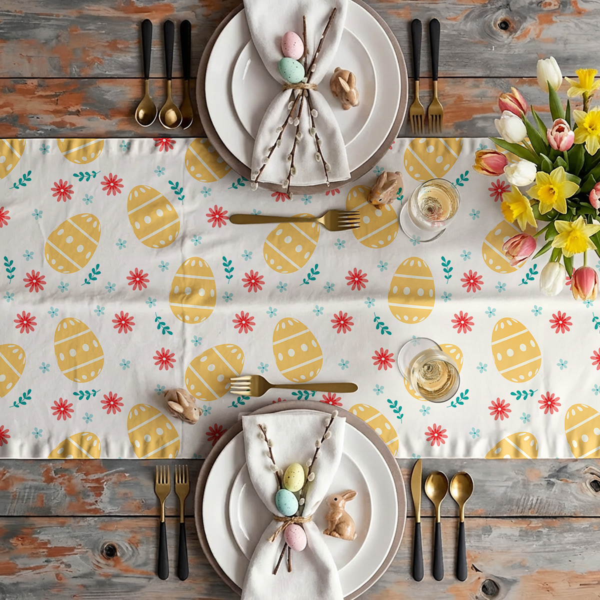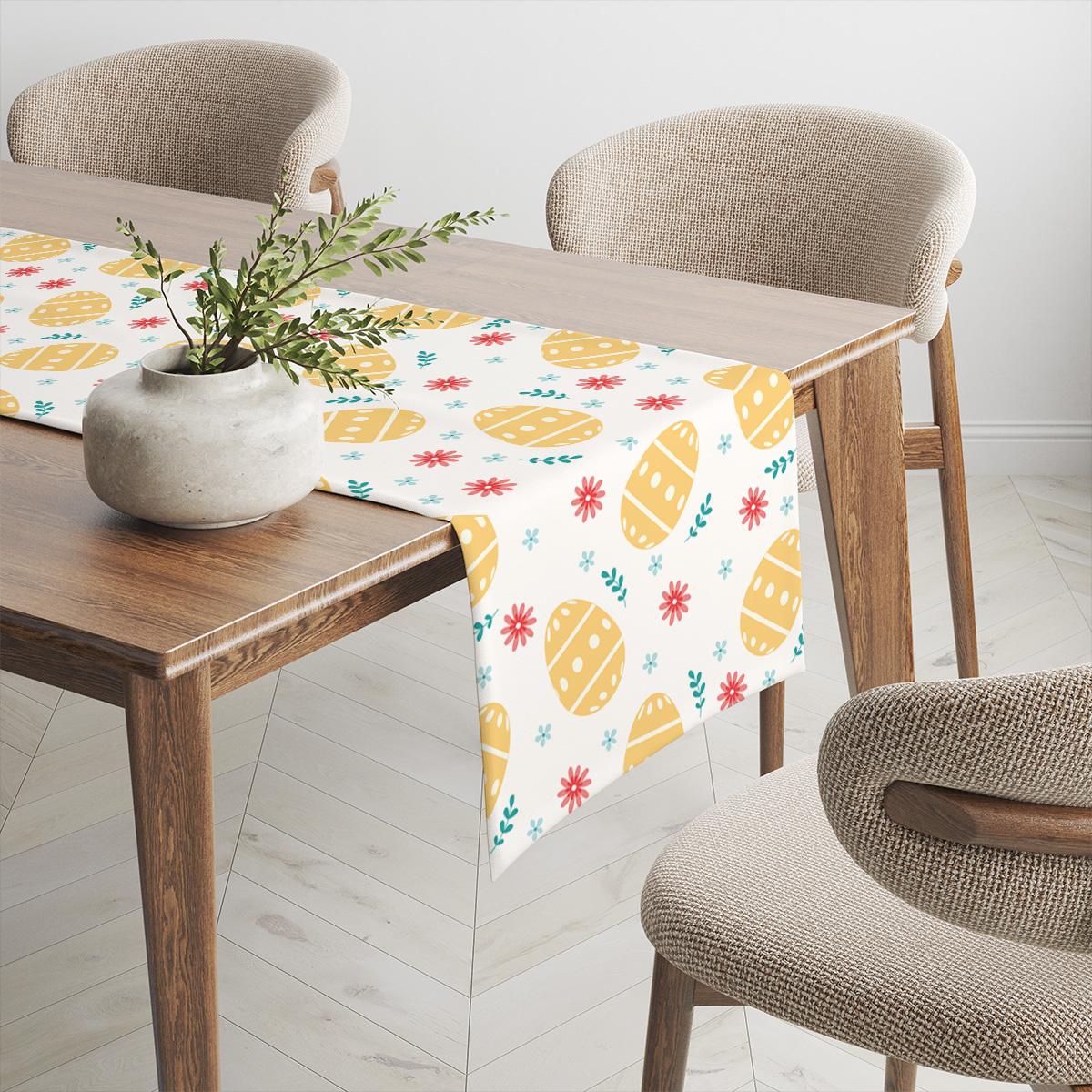 Ten bieżnik zachwyca wesołym, świątecznym wzorem: żółte pisanki rozrzucone między drobnymi kwiatkami i zielonymi gałązkami tworzą lekką, radosną kompozycję. Całość utrzymana jest w pastelowej, przyjemnej palecie kolorystycznej, która harmonijnie współgra z naturalnymi materiałami stołu.