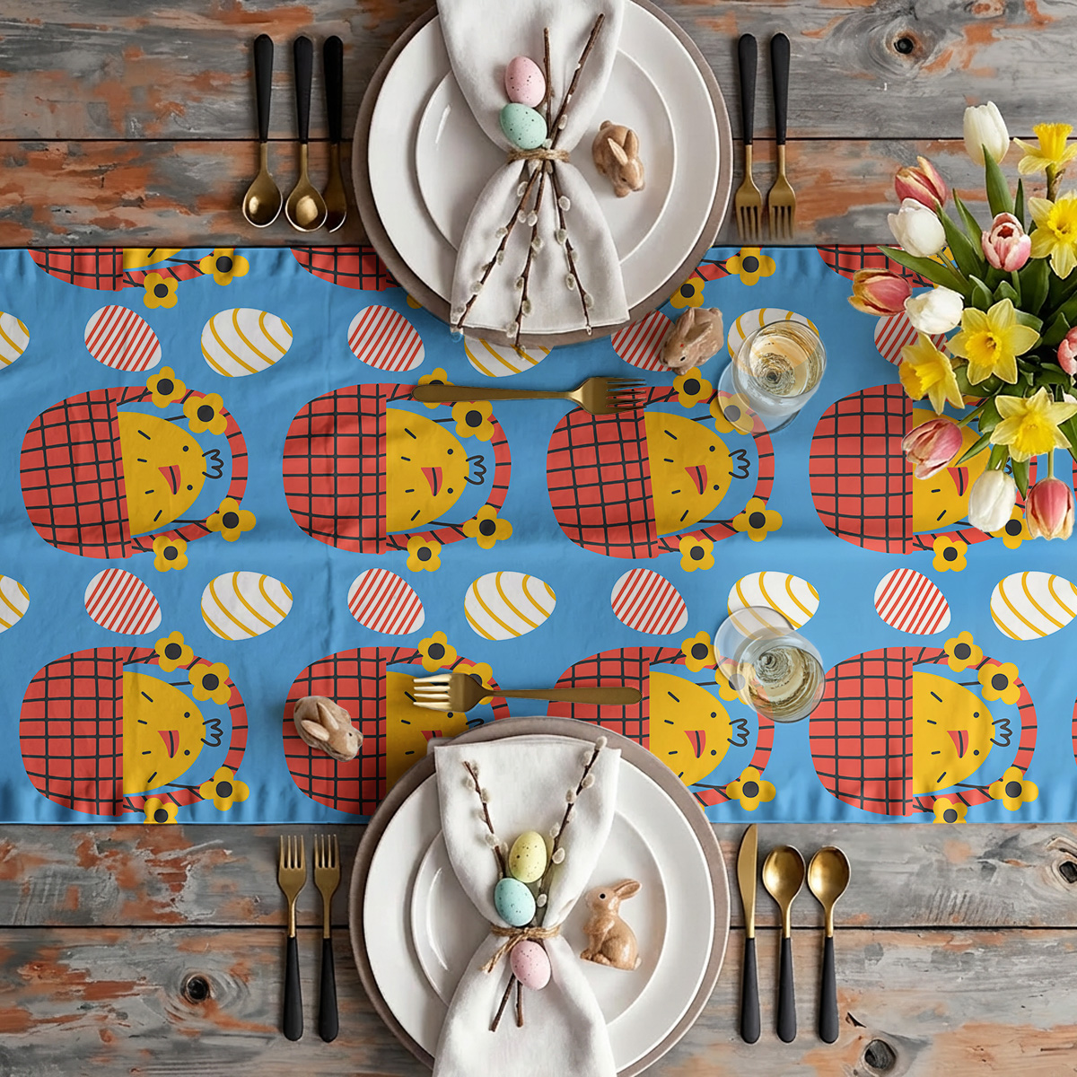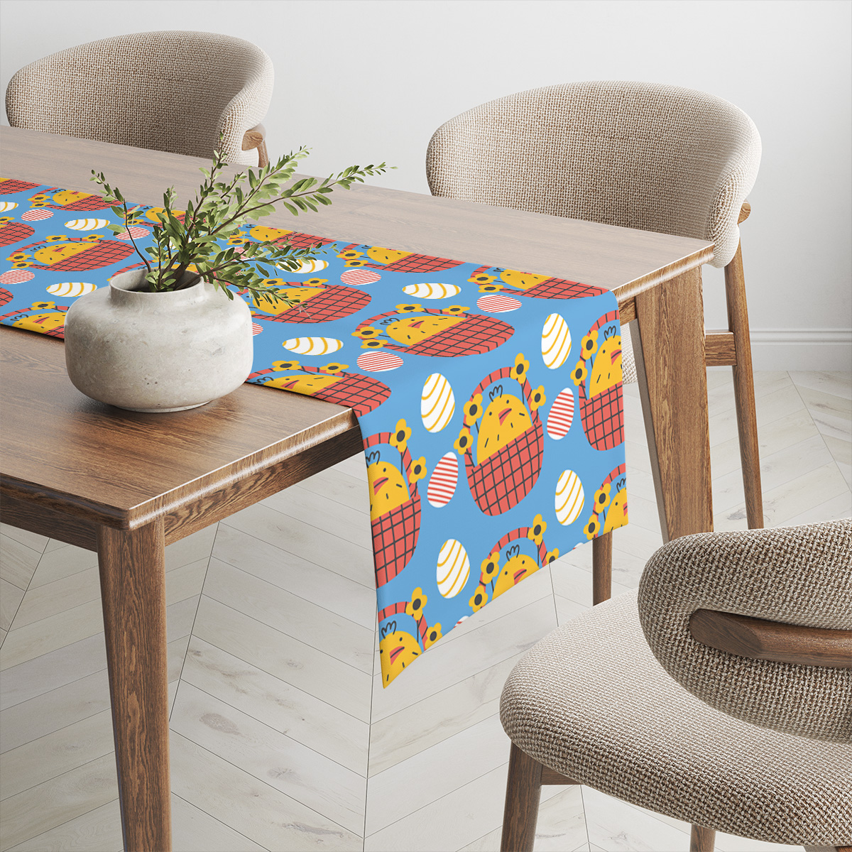 Wesoły nadruk przedstawia żółte kurczaczki w czerwonych koszykach na intensywnie niebieskim tle, przeplatane dekoracyjnymi pisankami. Motyw jest przyjazny i pełen energii, świetnie wpisując się w rodzinne, świąteczne klimaty. Projekt doskonale komponuje się z naturalnymi dodatkami, takimi jak świeże kwiaty czy rustykalne zastawy, tworząc spójną wielkanocną stylizację. Kontrastowe kolory przyciągają wzrok i ożywiają stół. Na zdjęciach widoczne są detale wzoru — kratkowane koszyki, małe kwiatki i ozdobne pisanki — które dodają projektowi charakteru i zabawy. Powtarzalny motyw zapewnia czytelny efekt dekoracyjny na całej powierzchni bieżnika. Bieżnik sprawdzi się jako centralny element aranżacji podczas świątecznych spotkań, wprowadzając radosną atmosferę i kolor. Dzięki wyrazistemu wzorowi łatwo go dopasować do istniejących dekoracji. Można go zestawić z jednolitymi serwetkami i dodatkami w stonowanych odcieniach, aby podkreślić motyw kurczaczków i pisanek oraz stworzyć przyjemne, świąteczne wnętrze.