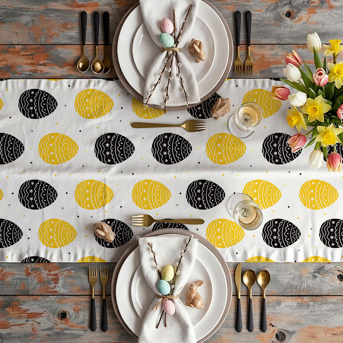 Ten bieżnik ozdabia stół wzorem rysunkowych pisanek rozmieszczonych na jasnym tle, gdzie żółte i czarne motywy tworzą wyraźny, przyciągający wzrok kontrast.