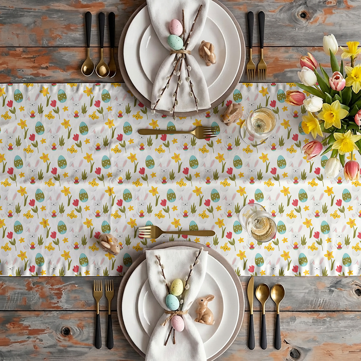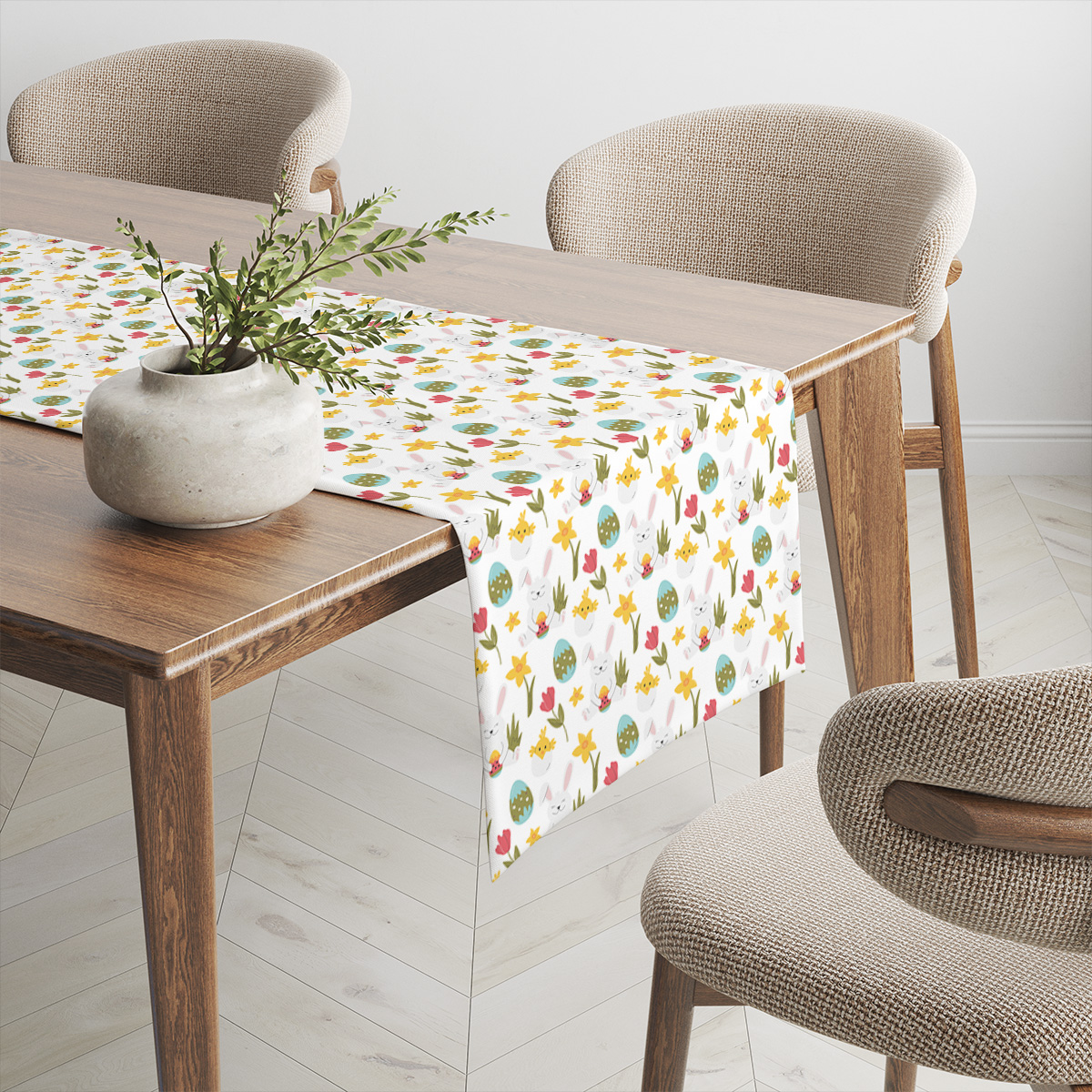 Ten bieżnik wnosi na stół radosny, wielkanocny klimat dzięki powtarzającym się motywom zajączków, pisanek i małych kurczaczków. Delikatne tulipany i żonkile przełamują białe tło, tworząc lekki i pogodny wzór idealny na świąteczne spotkania.