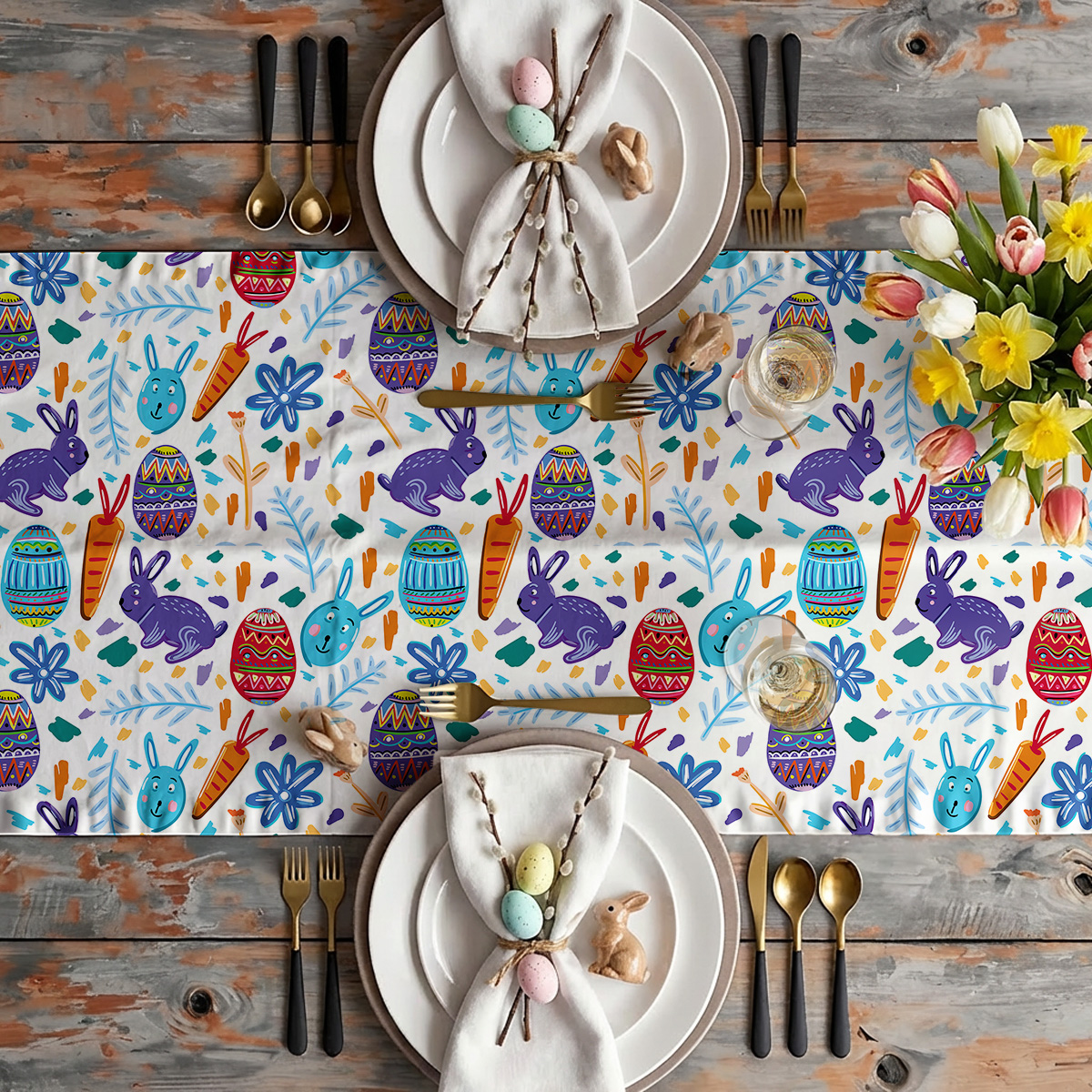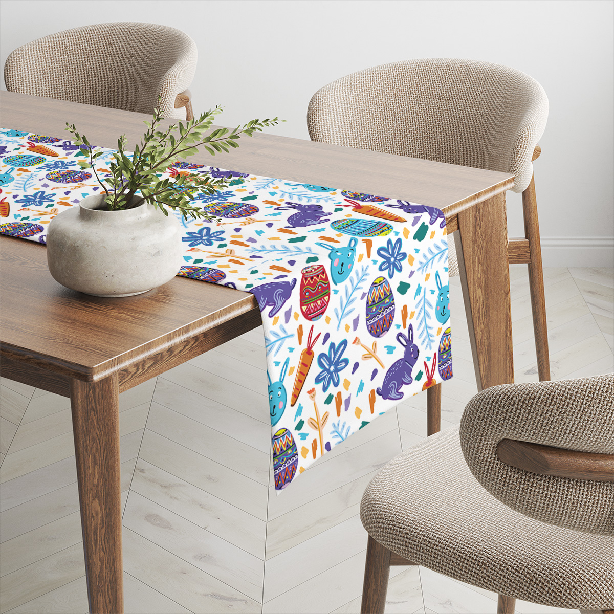 Kolorowy bieżnik z radosnym motywem zajączków, pisanek i marchewek wprowadza świąteczny klimat do jadalni.