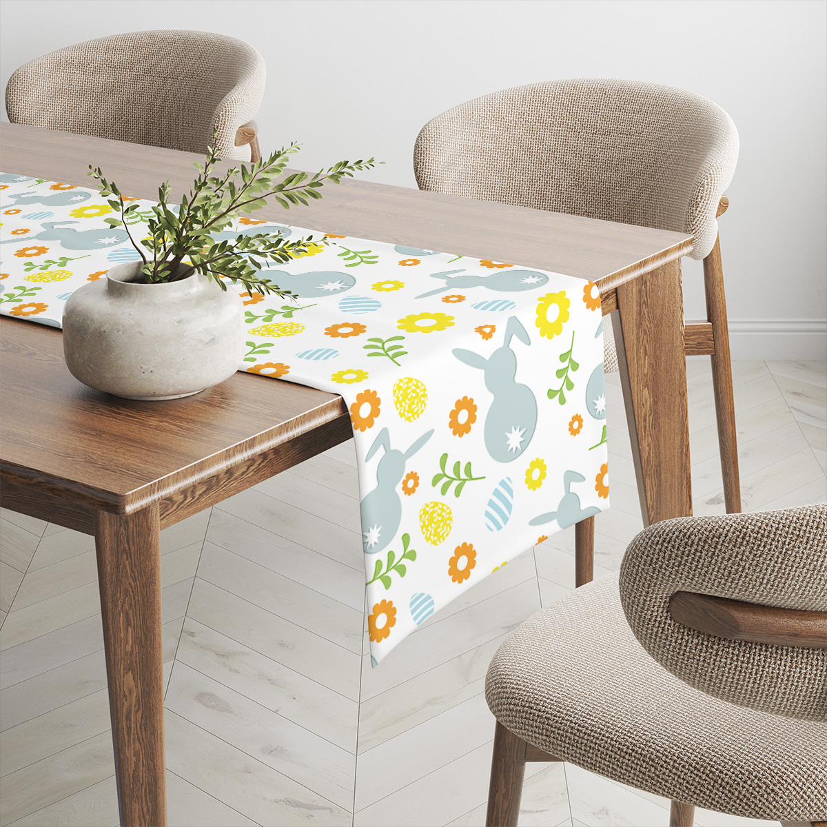 Ten bieżnik to lekka i radosna propozycja dekoracji stołu na okres wiosenny i wielkanocny. Grafika z delikatnymi sylwetkami zajączków, wzorami pisanek oraz drobnymi kwiatami tworzy przyjazny, świąteczny klimat.