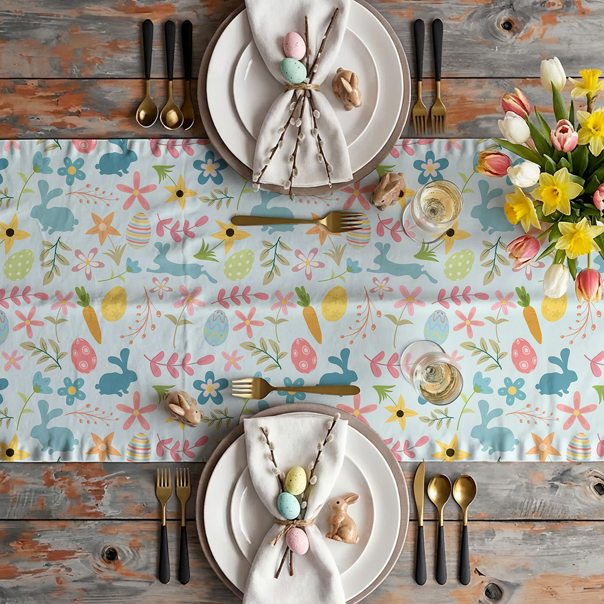 Ten bieżnik przedstawia radosny motyw wielkanocny z zajączkami, kolorowymi pisankami i delikatnymi kwiatami, utrzymany w miękkich pastelach.
