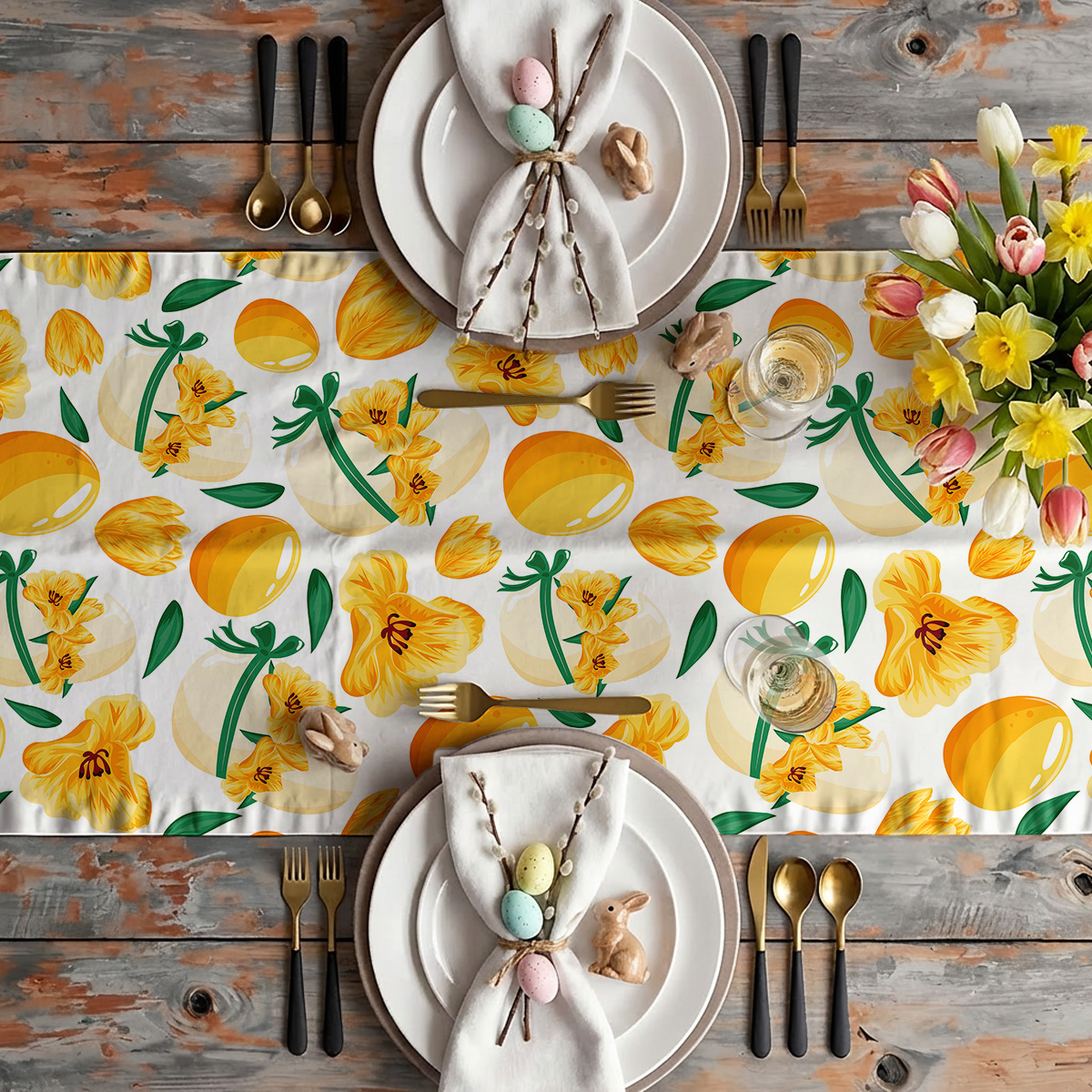 Bieżnik wielkanocny na stół – żółte pisanki i wiosenne kwiaty