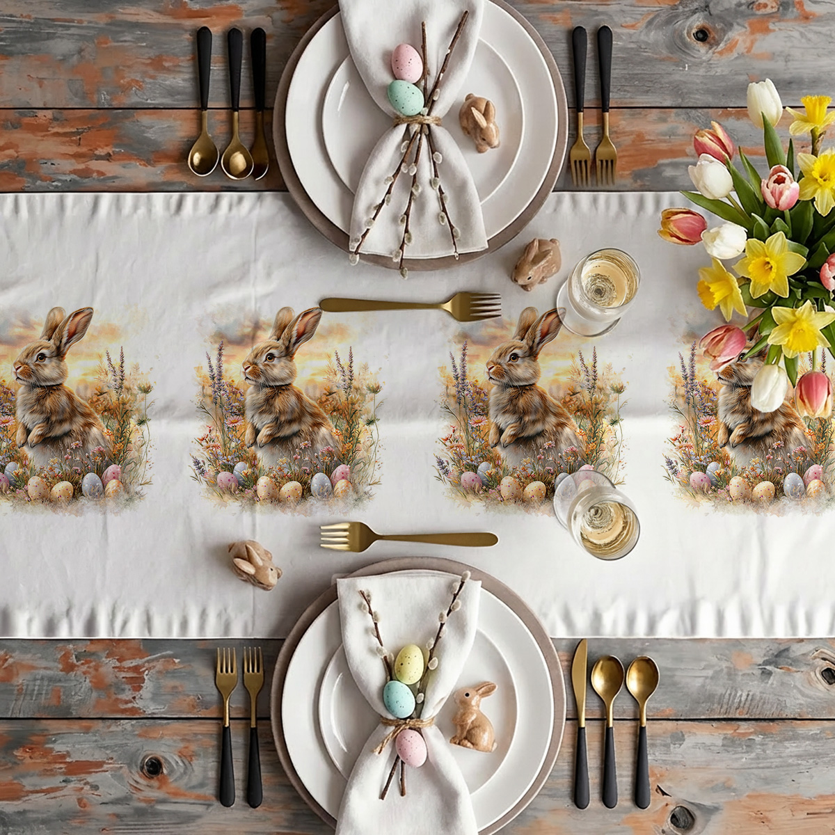 Delikatny motyw akwarelowego króliczka w łące, otoczony pastelowymi pisankami i polnymi kwiatami, tworzy subtelną, świąteczną atmosferę na stole. Neutralne tony i malarski styl sprawiają, że bieżnik pasuje zarówno do klasycznych, jak i rustykalnych aranżacji. Wykonany z przyjemnej w dotyku tkaniny bieżnik łączy estetykę z funkcjonalnością; tkanina jest plamoodporna — odporna na plamy i łatwa do czyszczenia, co ułatwia utrzymanie świątecznego wystroju.
