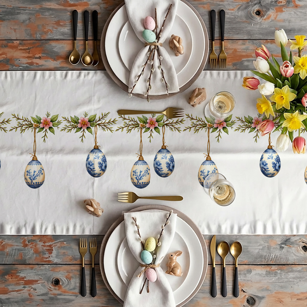Subtelny bieżnik zdobi wąski pas powtarzających się gałązek z ozdobnymi, niebiesko-kremowymi pisankami i drobnymi kwiatami. Ten świąteczny motyw łączy klasyczną porcelanową estetykę z naturalnym akcentem zieleni, tworząc elegancką dekorację stołu.