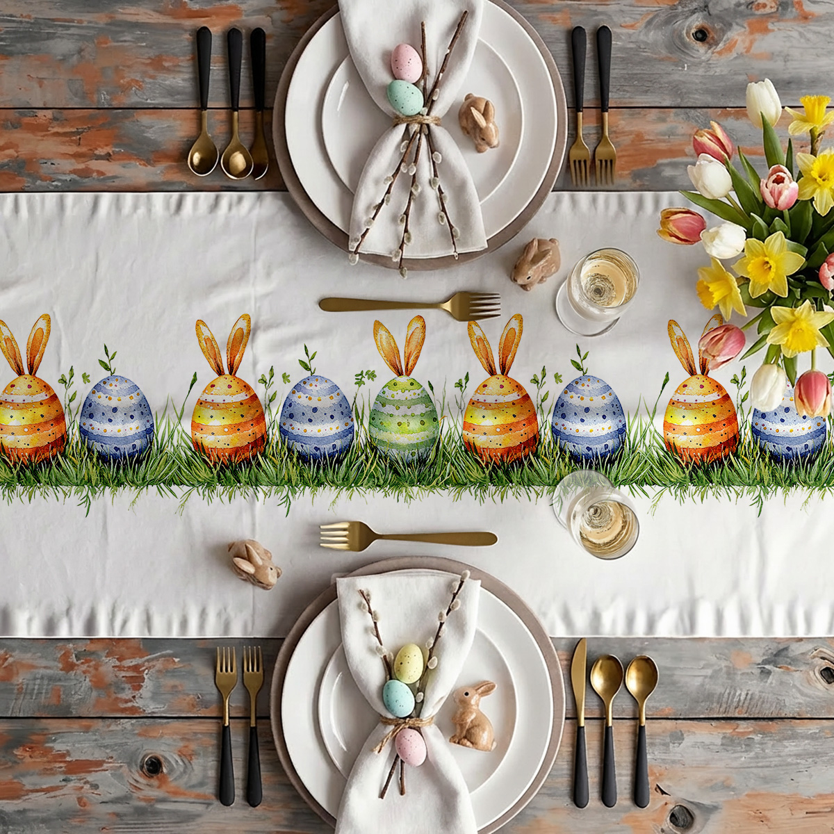 Wzór przedstawia rząd kolorowych pisanek z uszami wśród trawy, malowanych w ciepłych i chłodnych tonach, co nadaje mu lekkości i zabawnego charakteru. Możesz zestawić bieżnik ze stonowaną zastawą lub złotymi akcentami, by podkreślić jego świąteczny klimat.
