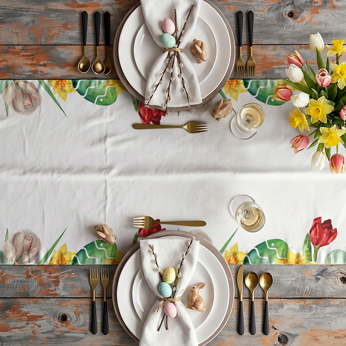 Delikatny bieżnik ozdobiony akwarelowymi tulipanami, żonkilami i malowanymi pisankami tworzy subtelny, wiosenny akcent. Świetnie sprawdzi się jako elegancka dekoracja stołu podczas świątecznych spotkań, dodając przytulnej atmosfery.