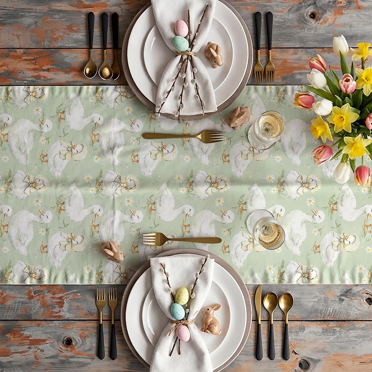 Świąteczny obrus wielkanocny z urokliwym motywem kaczuszek wniesie wiosenny klimat na stół. Delikatne stokrotki i pastelowa zieleń tworzą subtelną dekorację świąteczną, idealną do rodzinnego śniadania.
