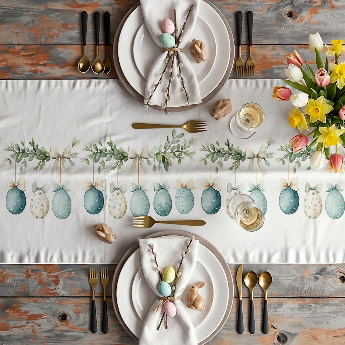 Ten świąteczny bieżnik ozdabia stół subtelnym pasem gałązek z wiszącymi pisankami i delikatnymi kokardami, namalowanymi w akwarelowej palecie mięty i beżu. Motyw wprowadza naturalny, elegancki nastrój i pięknie komponuje się z wiosenną zastawą.