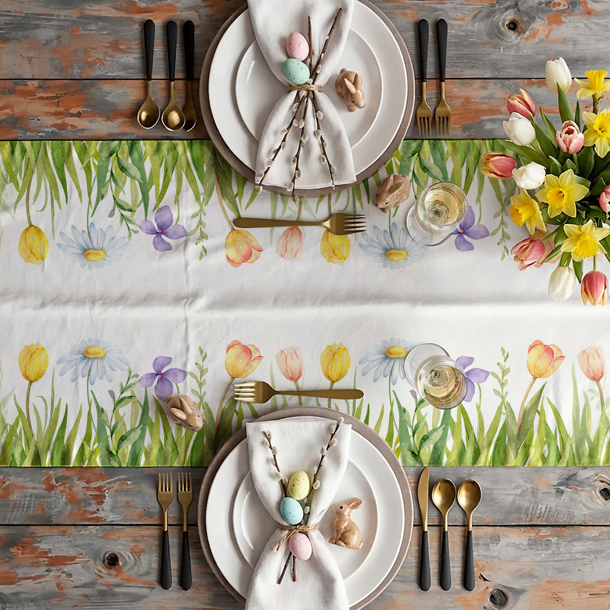 Akwarelowy wzór przedstawia delikatne tulipany i stokrotki otoczone świeżą, zieloną trawą, tworząc lekki, wiosenny akcent na stole.