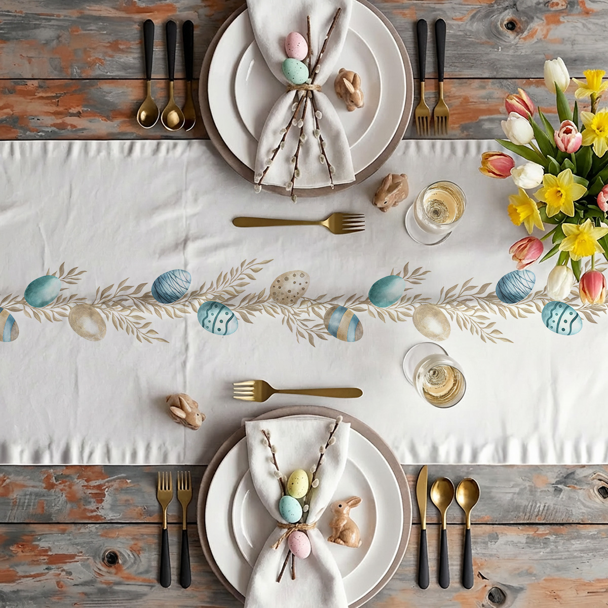 Ten bieżnik prezentuje prosty, elegancki wzór: oplecione gałązki z delikatnymi, ręcznie malowanymi pisankami w stonowanych pastelach na jasnym tle. Kompozycja jest subtelna i nadaje stołowi lekkości, jednocześnie podkreślając świąteczny charakter nakrycia.