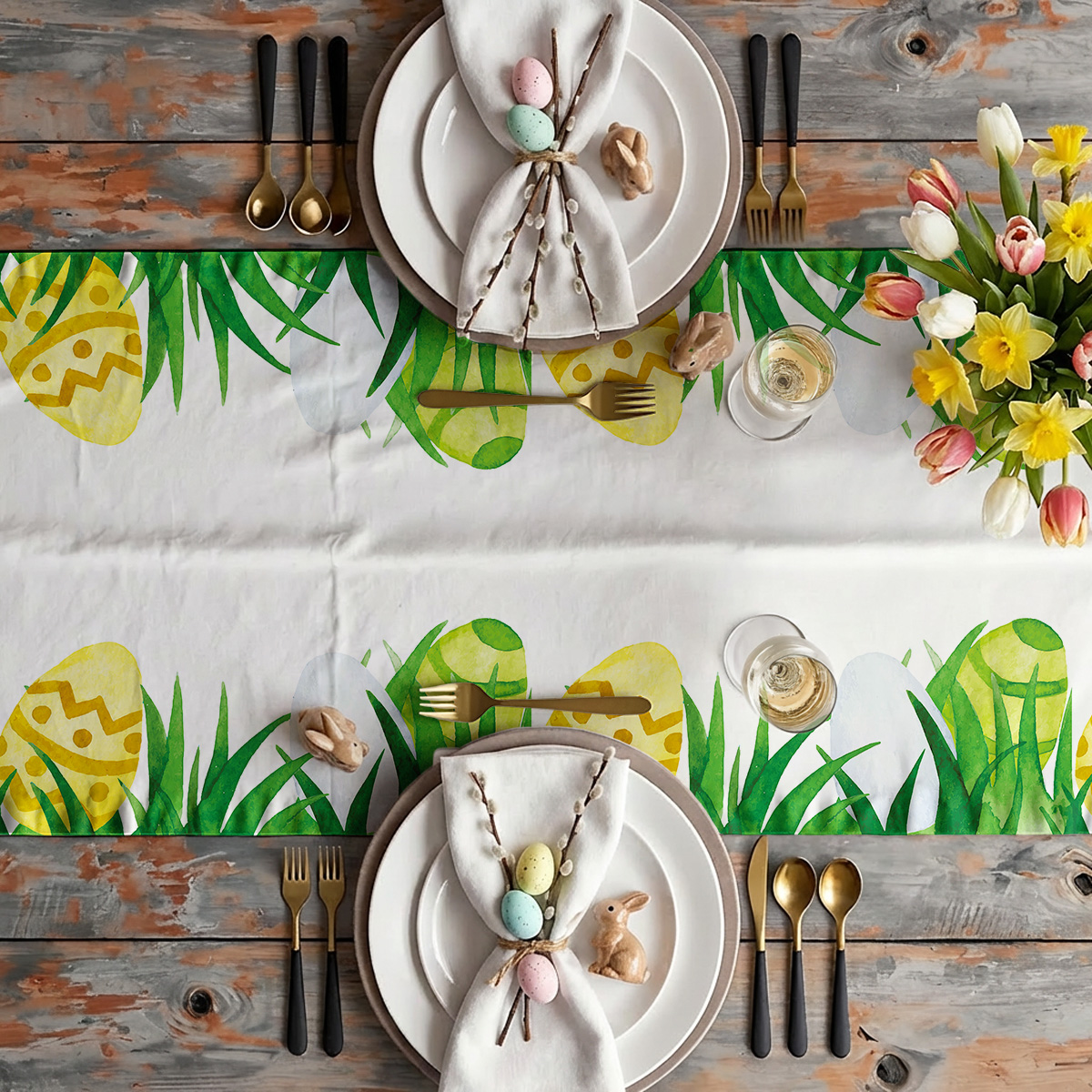 Radosny bieżnik z motywem malowanych pisanek ukrytych w soczystej zieleni trawy. Idealny do świątecznego stołu, doda aranżacji lekkości i wiosennego charakteru.