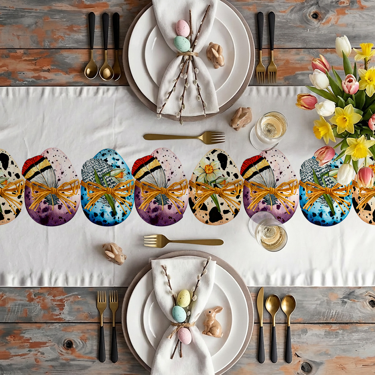 Dekoracyjny bieżnik z kolorowymi pisankami wiązanymi wstążkami i drobnymi gałązkami doda świątecznego charakteru stołowi. Wyraźny, akwarelowy nadruk i stonowane tło sprawiają, że aranżacja wygląda elegancko i przytulnie.