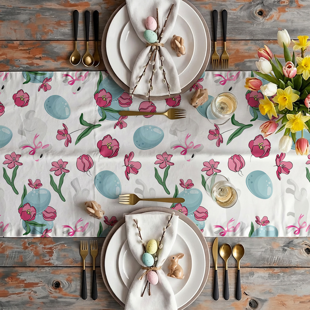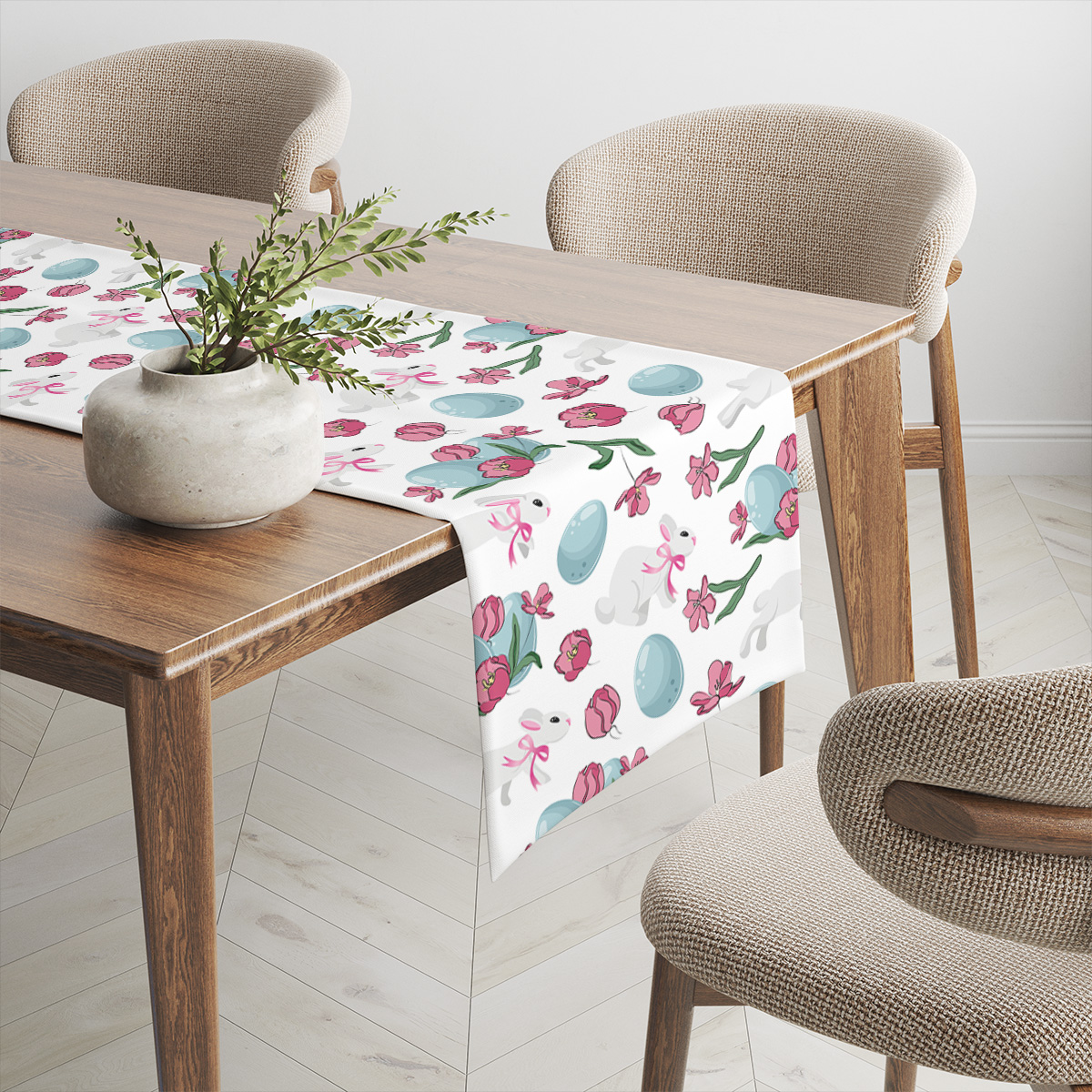 Ten bieżnik łączy prostotę z radosnym, świątecznym motywem — białe zajączki, niebieskie pisanki i różowe tulipany tworzą lekki, powtarzalny wzór na jasnym tle. Delikatne akcenty i pastelowe barwy sprawiają, że dekoracja pasuje zarówno do rustykalnych, jak i nowoczesnych aranżacji stołu.