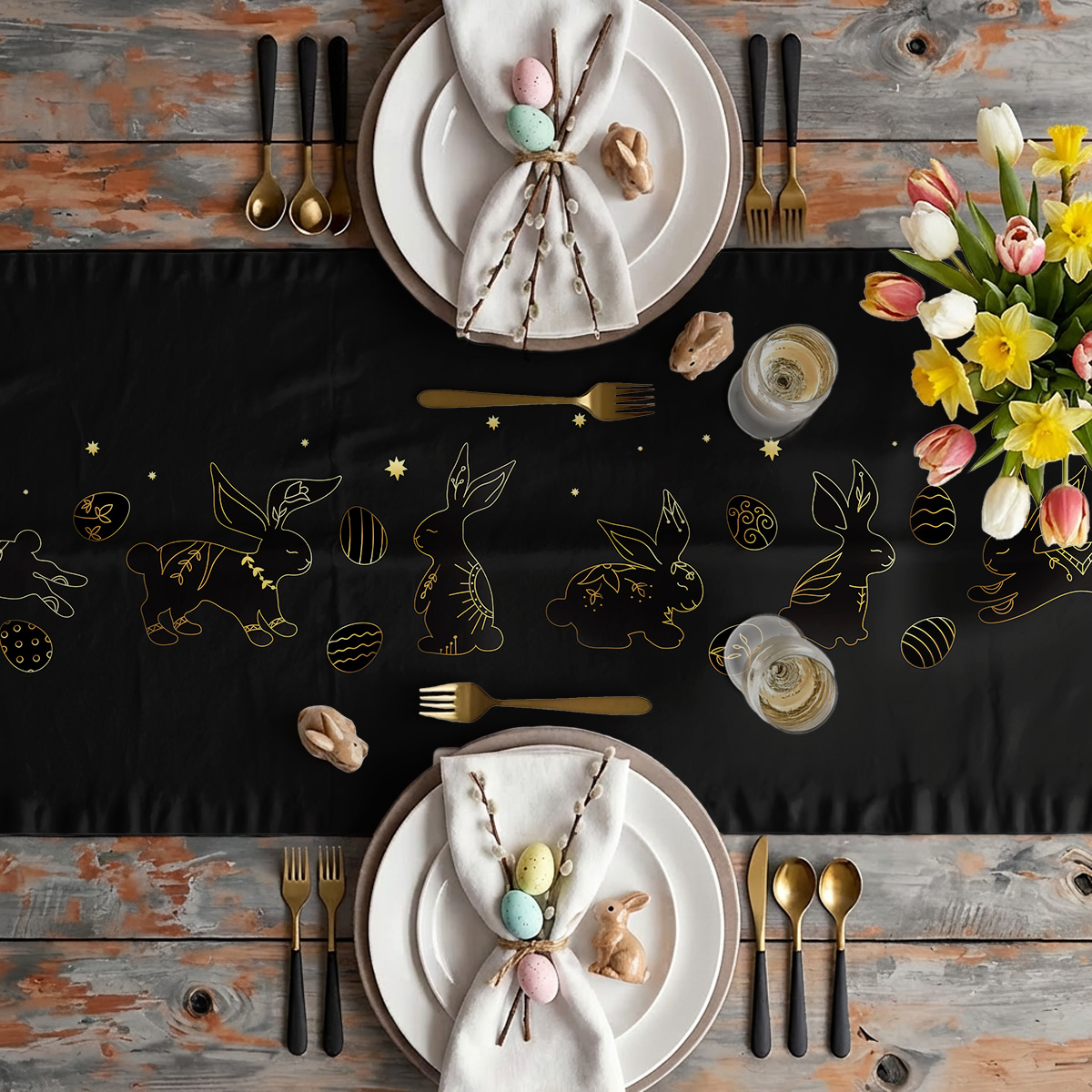 Czarny materiał z cienkimi, złotymi konturami zajączków i pisanek tworzy wyszukaną, minimalistyczną kompozycję, która pięknie kontrastuje z porcelaną i kwiatami. Wzór zaprojektowano tak, by przyciągać wzrok, jednocześnie zachowując subtelność i elegancję.