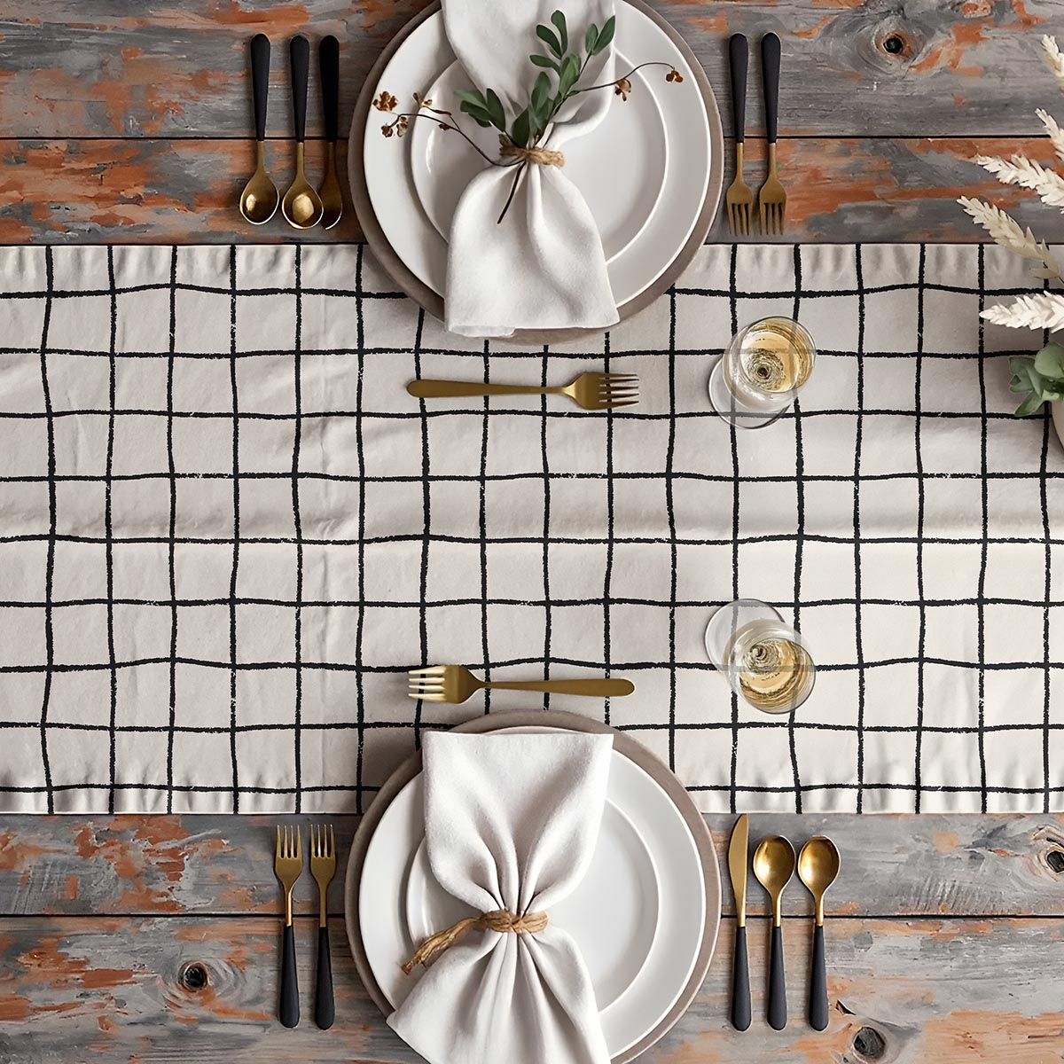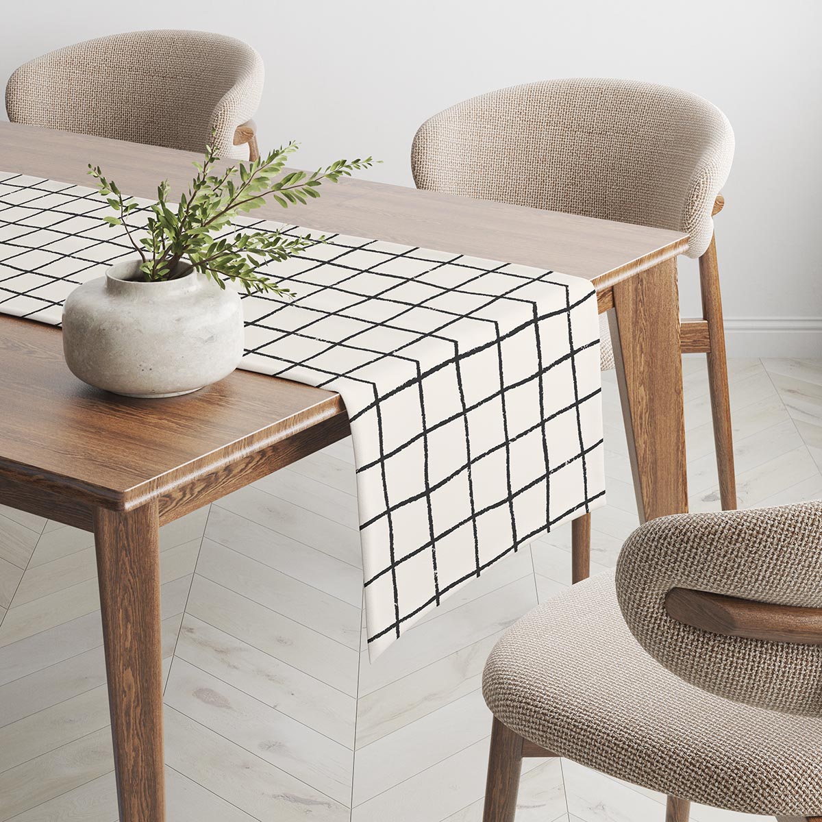 Wyrazista, ręcznie wyglądająca krata na jasnym tle tworzy efekt lekko surowej, a jednocześnie przytulnej estetyki. Nieregularne, pędzlowe kreski nadają wzorowi artystycznego charakteru, który dobrze kontrastuje z naturalnym drewnem stołu.