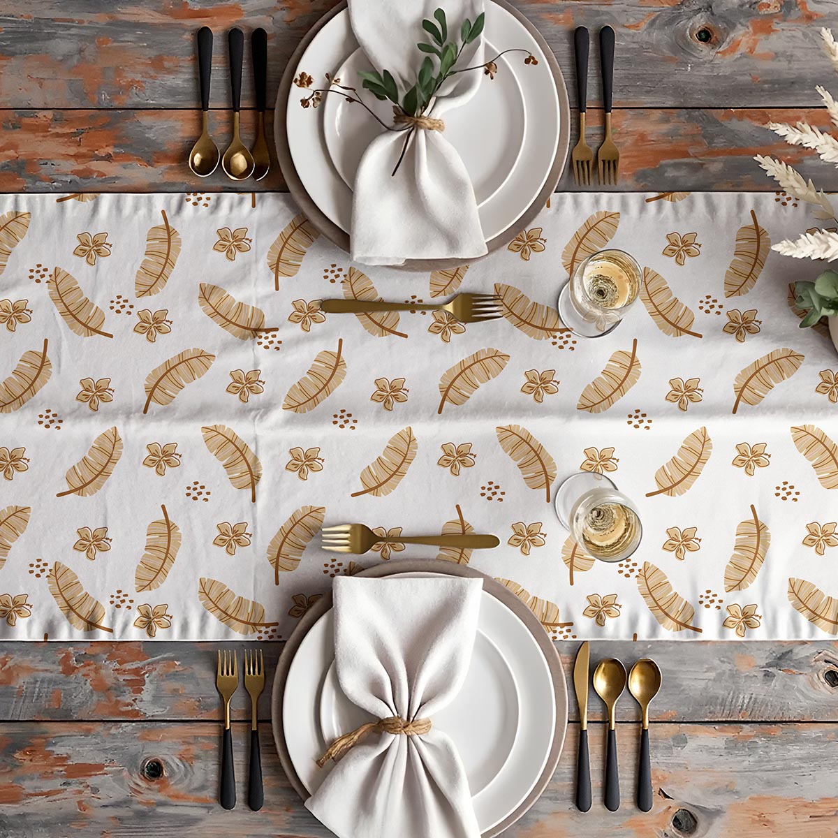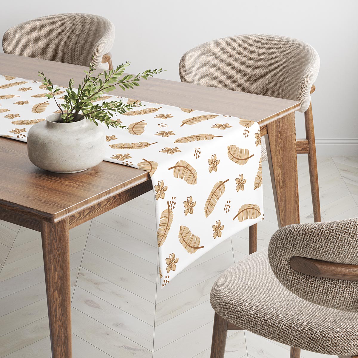 Ten bieżnik prezentuje subtelny, naturalny wzór z beżowymi piórami i małymi kwiatami na jasnym tle, co wprowadza ciepłą, spokojną atmosferę do jadalni. Wzór jest delikatny, ale dobrze widoczny, dlatego świetnie komponuje się z drewnianymi i ceramicznymi dodatkami.