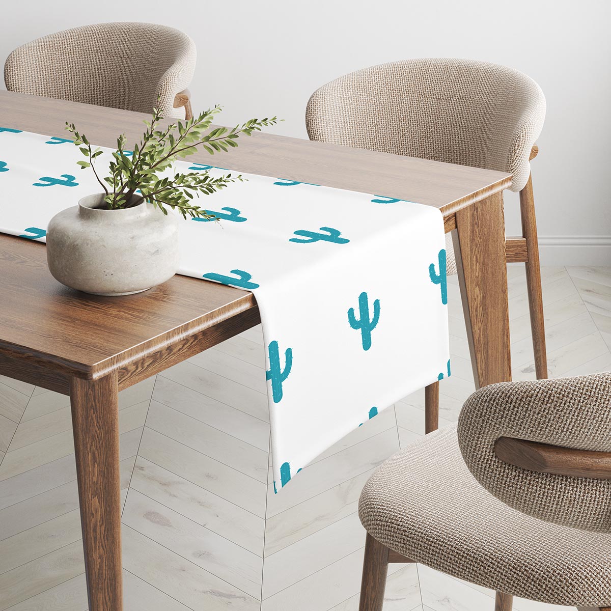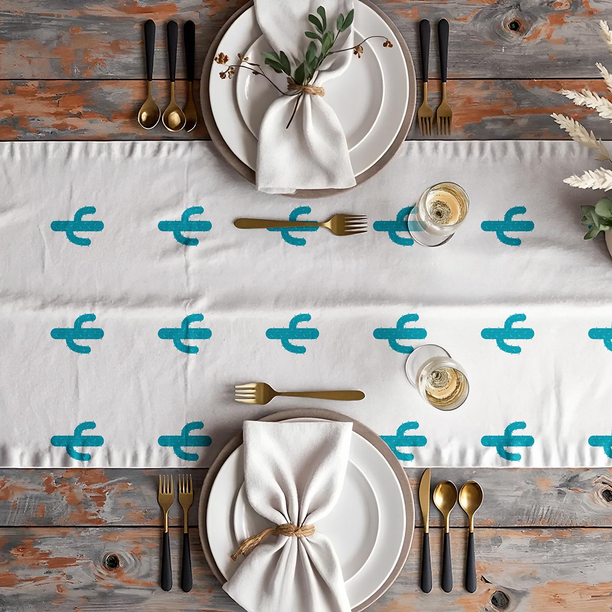 Ten bieżnik przyciąga wzrok prostym, rytmicznym wzorem turkusowych kaktusów na jasnym tle. Motyw jest wyrazisty, ale zachowany w lekkiej, minimalistycznej stylistyce, dzięki czemu pasuje do wielu aranżacji stołu.