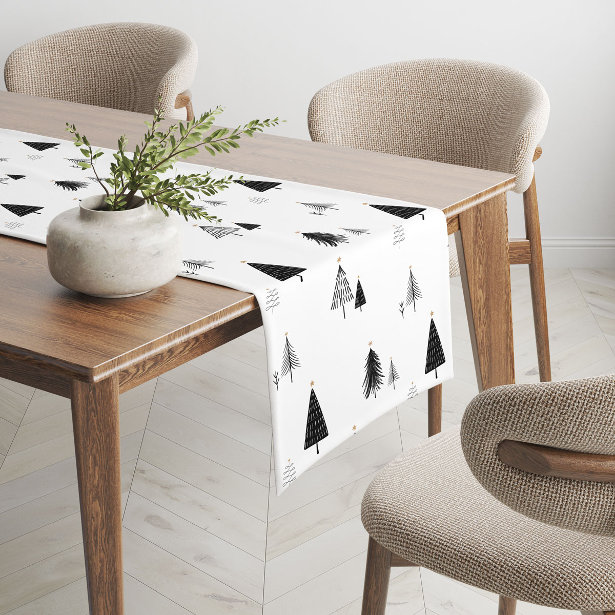 Elegancki świąteczny bieżnik w białym kolorze z minimalistycznymi czarnymi choinkami. Idealny na nowoczesny, zimowy stół. Dostępny w dowolnym wymiarze.