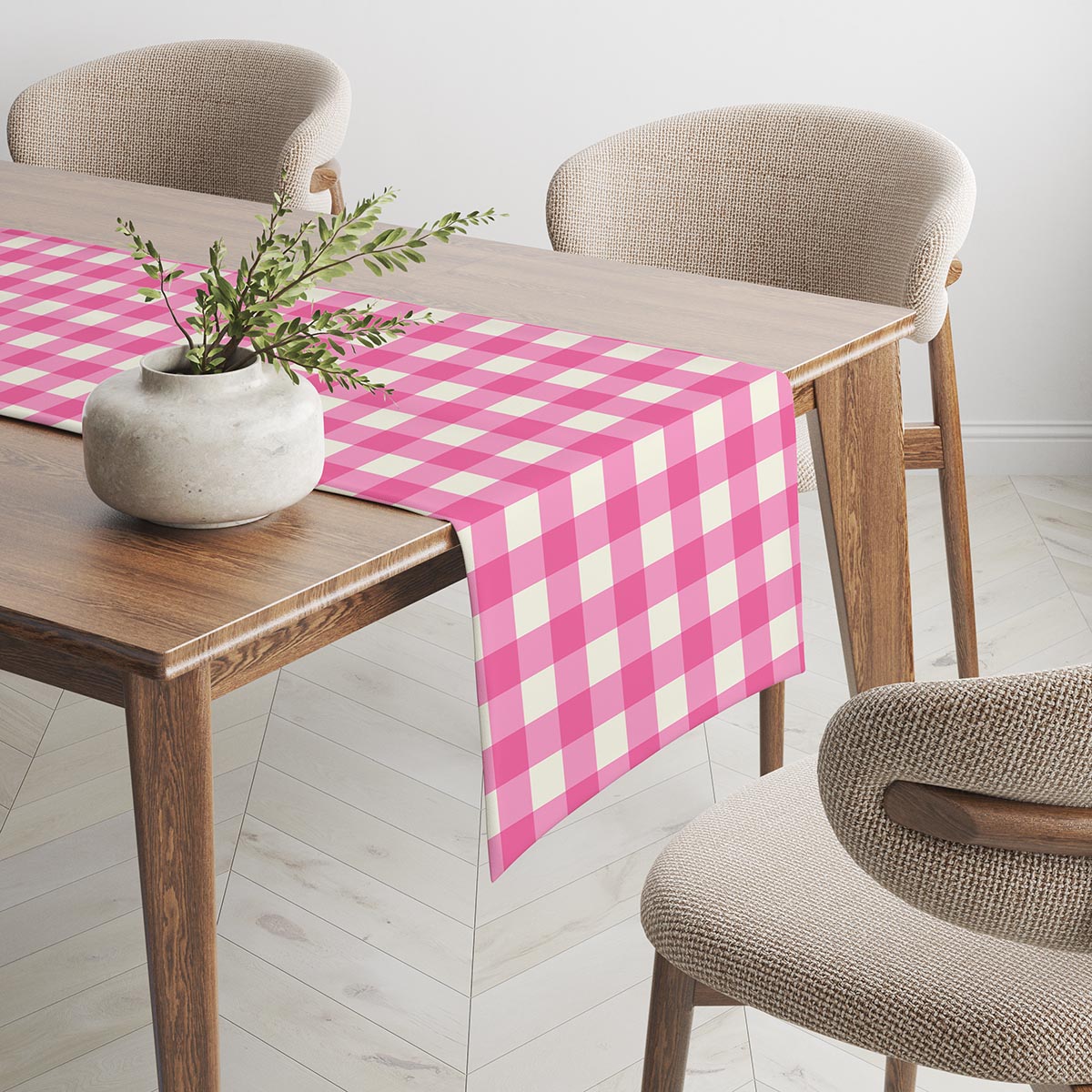 Radosny bieżnik w klasyczną kratę doda stołowi energii i stylu. Intensywny róż przełamany kremowym akcentem sprawdzi się w codziennych i świątecznych aranżacjach.