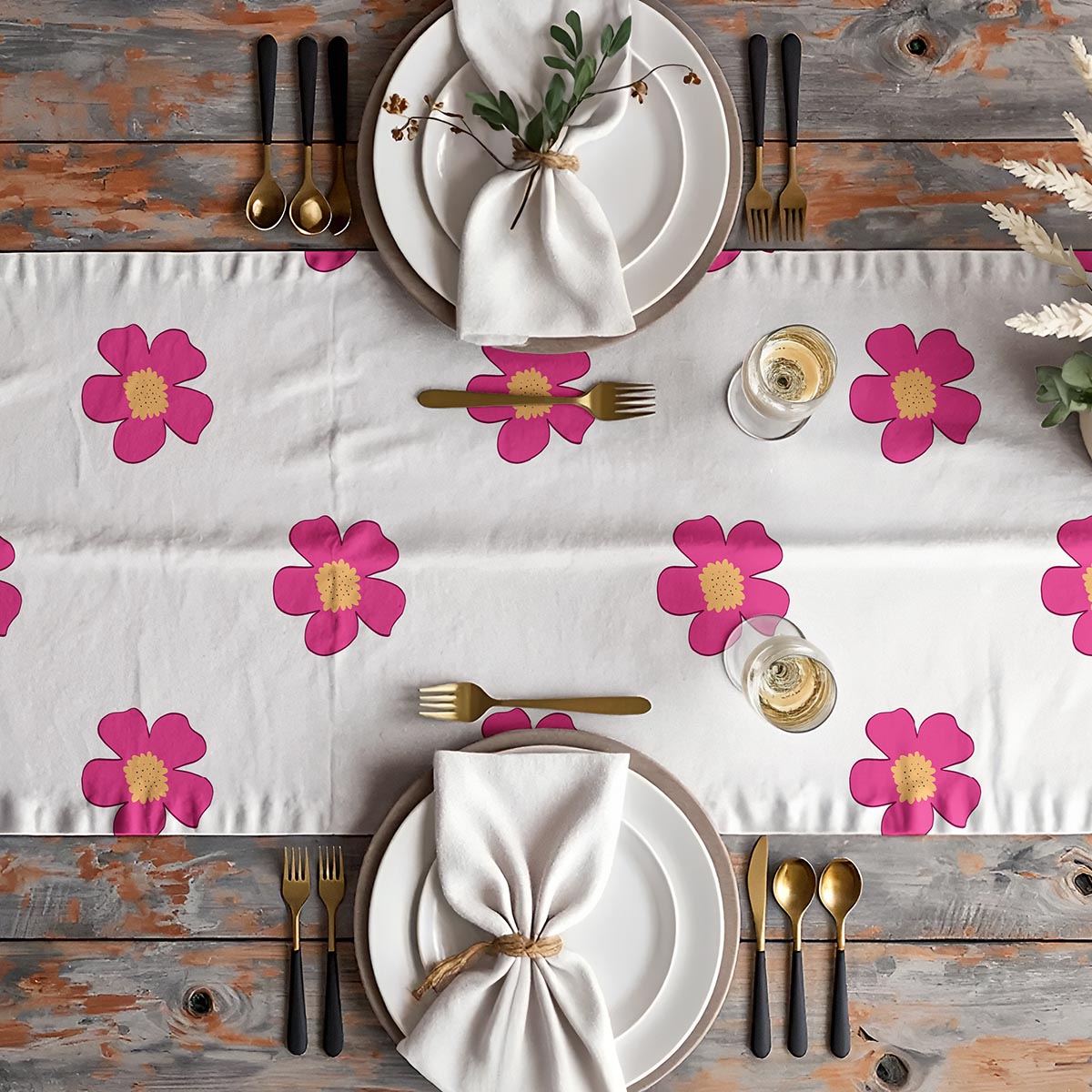 Delikatny bieżnik z dużymi, prostymi motywami kwiatowymi w żywym różu wniesie energię i urok do każdego stołu. Neutralne tło sprawia, że wzór harmonijnie łączy się z różnymi aranżacjami — od codziennych śniadań po uroczyste kolacje.