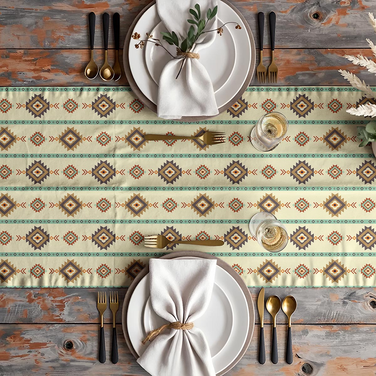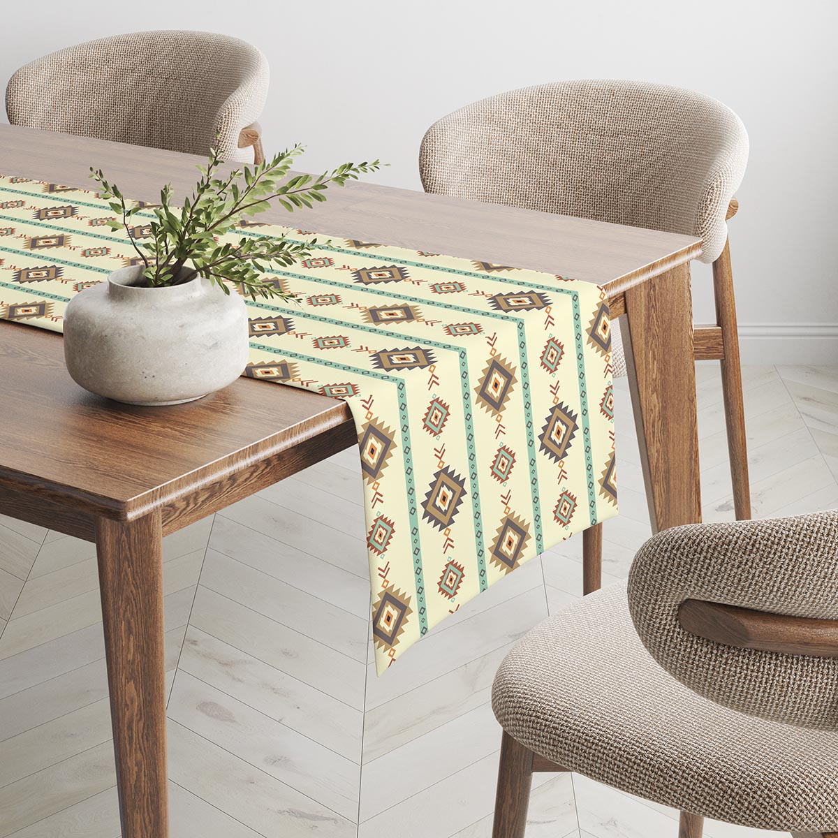 Dekoracyjny bieżnik o delikatnym, etnicznym wzorze wnosi do wnętrza subtelną egzotykę. Pastelowe romby i miękkie turkusowe pasy tworzą przyjemną, uniwersalną oprawę stołu.
