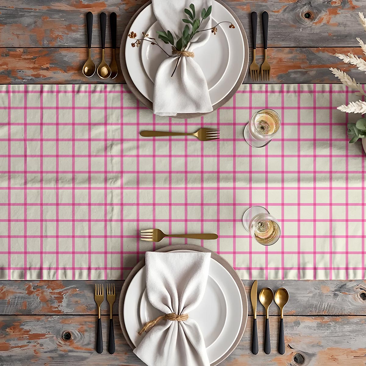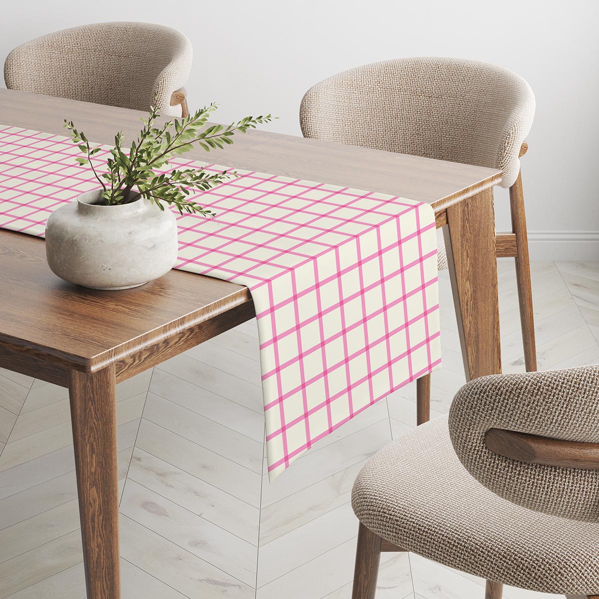 Subtelny bieżnik w jasnej, kremowej tkaninie z różową kratą doda stołowi świeżości i przytulnego charakteru. Świetnie sprawdzi się zarówno na codzienny obiad, jak i eleganckie spotkanie z bliskimi.